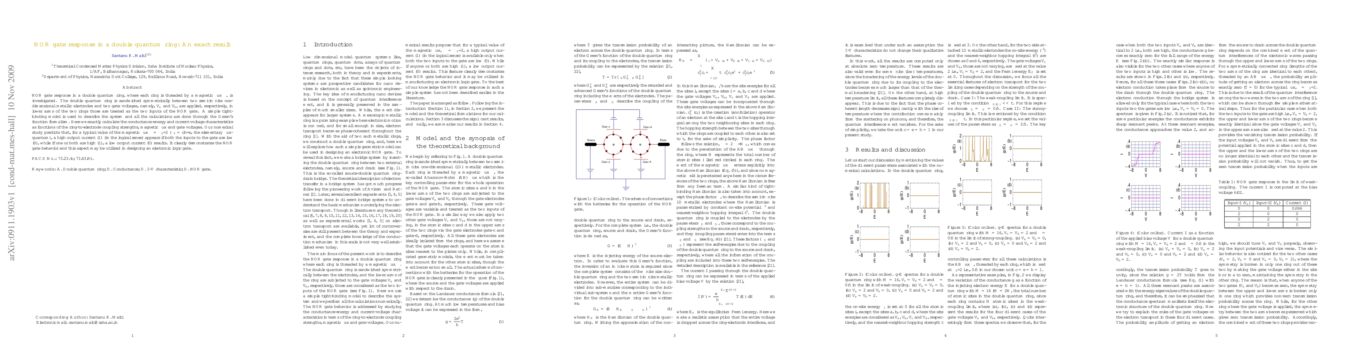 This paper investigates the NOR gate response in a double quantum ring system using a tight-binding model and Green's function formalism. The study reveals that the system exhibits NOR gate behavior, with a high output current when both inputs are low, and a low output current when one or both inputs are high.