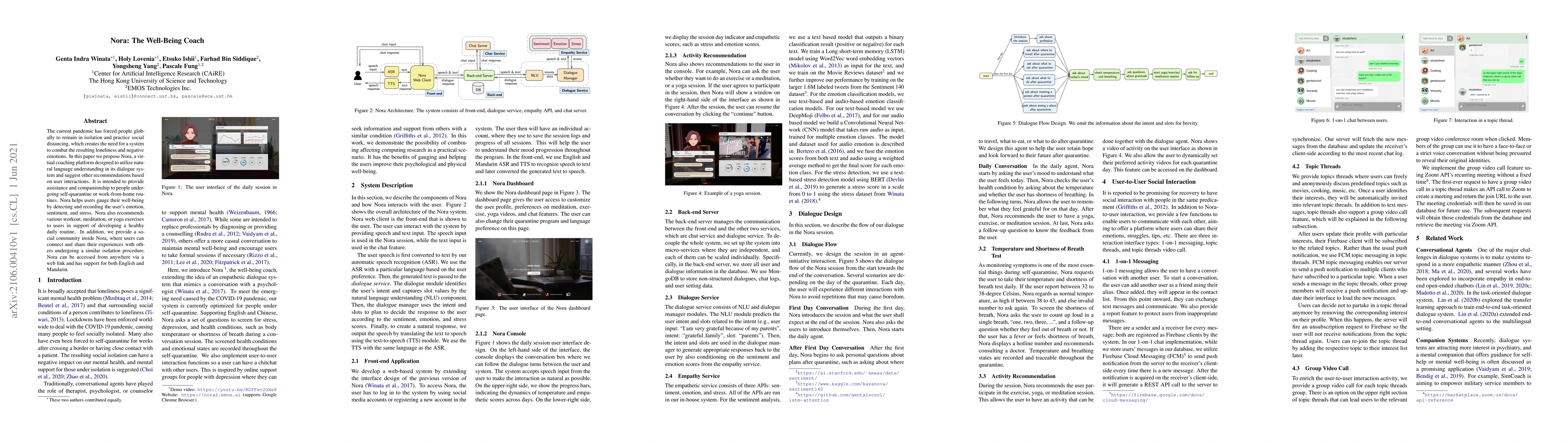 The current pandemic has forced people globally to remain in isolation and practice social distancing, which creates the need for a system to combat the resulting loneliness and negative emotions. In this paper we propose Nora, a virtual coaching platform designed to utilize natural language understanding in its dialogue system and suggest other recommendations based on user interactions. It is intended to provide assistance and companionship to people undergoing self-quarantine or work-from-home routines. Nora helps users gauge their well-being by detecting and recording the user's emotion, sentiment, and stress. Nora also recommends various workout, meditation, or yoga exercises to users in support of developing a healthy daily routine. In addition, we provide a social community inside Nora, where users can connect and share their experiences with others undergoing a similar isolation procedure. Nora can be accessed from anywhere via a web link and has support for both English and Mandarin.