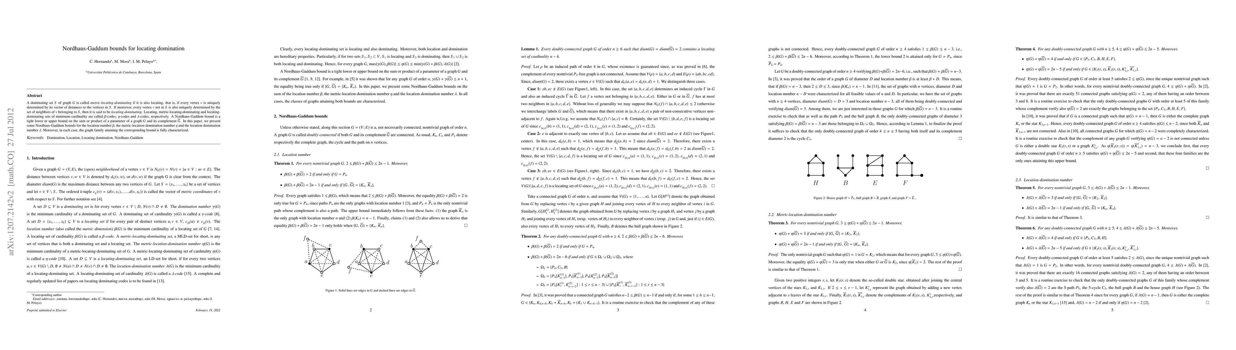 A dominating set S of graph G is called metric-locating-dominating if it is also locating, that is, if every vertex v is uniquely determined by its vector of distances to the vertices in S. If moreover, every vertex v not in S is also uniquely determined by the set of neighbors of v belonging to S, then it is said to be locating-dominating. Locating, metric-locating-dominating and locating-dominating sets of minimum cardinality are called b-codes, e-codes and l-codes, respectively. A Nordhaus-Gaddum bound is a tight lower or upper bound on the sum or product of a parameter of a graph G and its complement G. In this paper, we present some Nordhaus-Gaddum bounds for the location number b, the metric-location-number e and the location-domination number l. Moreover, in each case, the graph family attaining the corresponding bound is characterized.