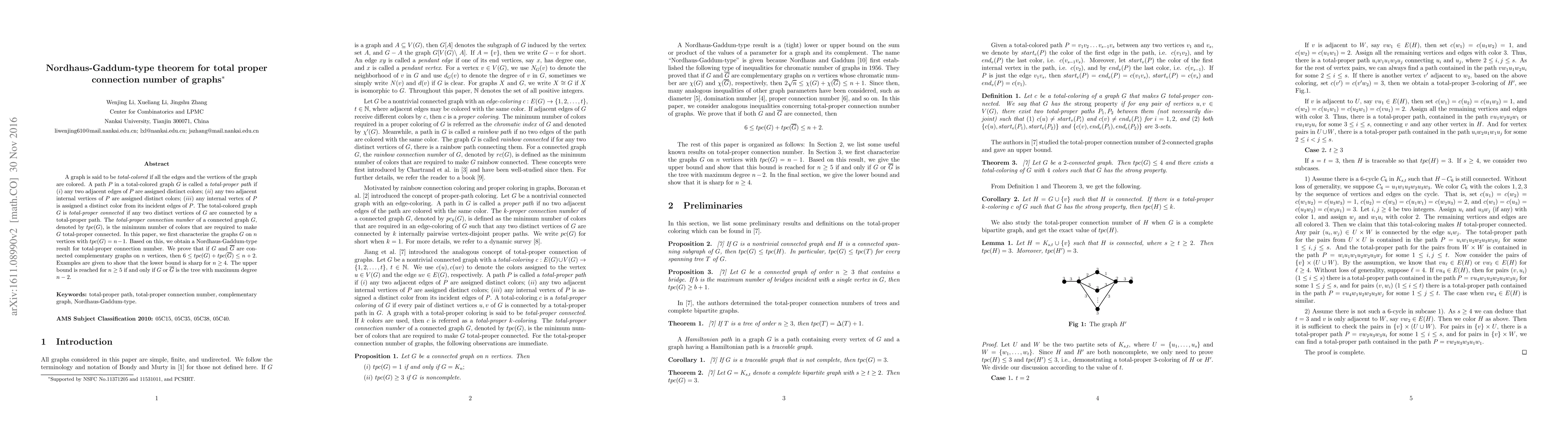 This paper investigates the total-proper connection number of graphs, which measures the minimum colors needed to ensure total-proper connectivity. The authors characterize graphs with a total-proper connection number of $n-1$ and establish a Nordhaus-Gaddum-type theorem, showing that for complementary graphs $G$ and $\overline{G}$, $6\leq tpc(G)+tpc(\overline{G})\leq n+2$, with the lower bound being sharp for $n\geq 4$.