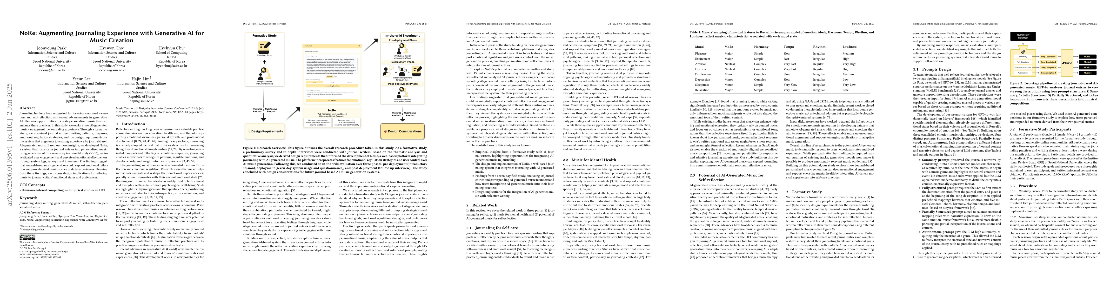 Journaling has long been recognized for fostering emotional awareness and self-reflection, and recent advancements in generative AI offer new opportunities to create personalized music that can enhance these practices. In this study, we explore how AI-generated music can augment the journaling experience. Through a formative study, we examined journal writers' writing patterns, purposes, emotional regulation strategies, and the design requirements for the system that augments journaling experience by journal-based AI-generated music. Based on these insights, we developed NoRe, a system that transforms journal entries into personalized music using generative AI. In a seven-day in-the-wild study (N=15), we investigated user engagement and perceived emotional effectiveness through system logs, surveys, and interviews. Our findings suggest that journal-based music generation could support emotional reflection and provide vivid reminiscence of daily experiences. Drawing from these findings, we discuss design implications for tailoring music to journal writers' emotional states and preferences.