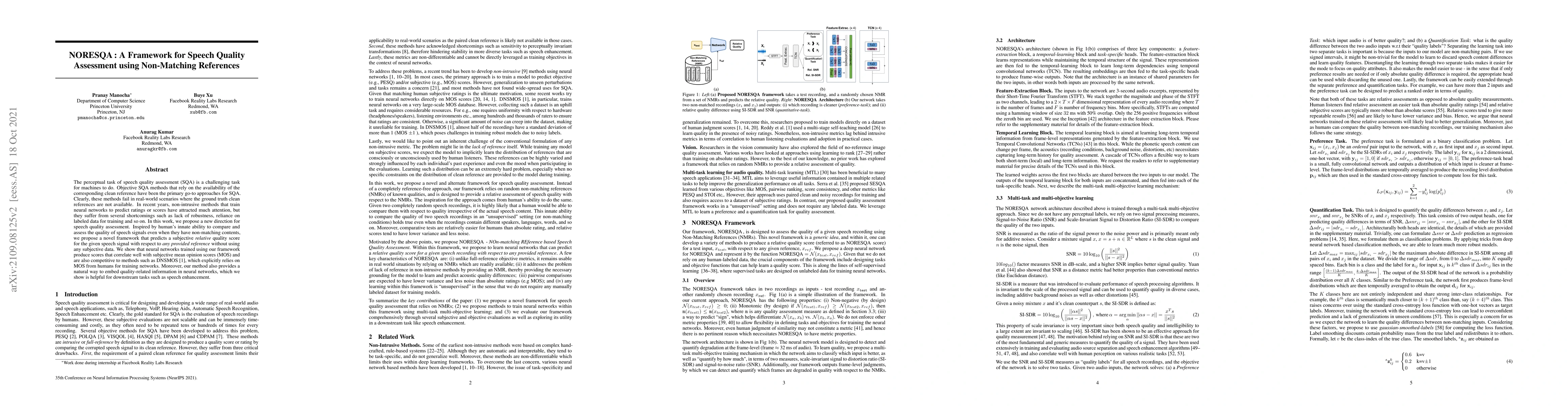 The paper introduces NORESQA, a novel framework for speech quality assessment that predicts relative quality scores without requiring clean reference signals or subjective data. The proposed method correlates well with human-rated mean opinion scores and outperforms traditional methods that depend on labeled data.
