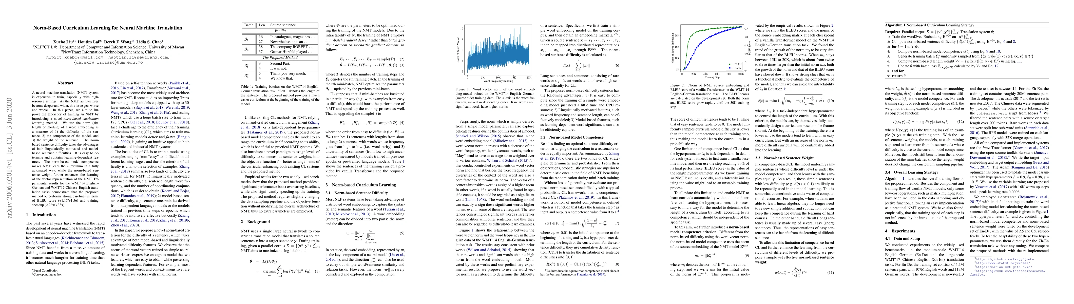 This paper proposes a norm-based curriculum learning method to enhance the efficiency of training neural machine translation (NMT) systems. The method leverages word embedding norms to determine sentence difficulty, model competence, and sentence weight, leading to improved BLEU scores and significant training speedups.