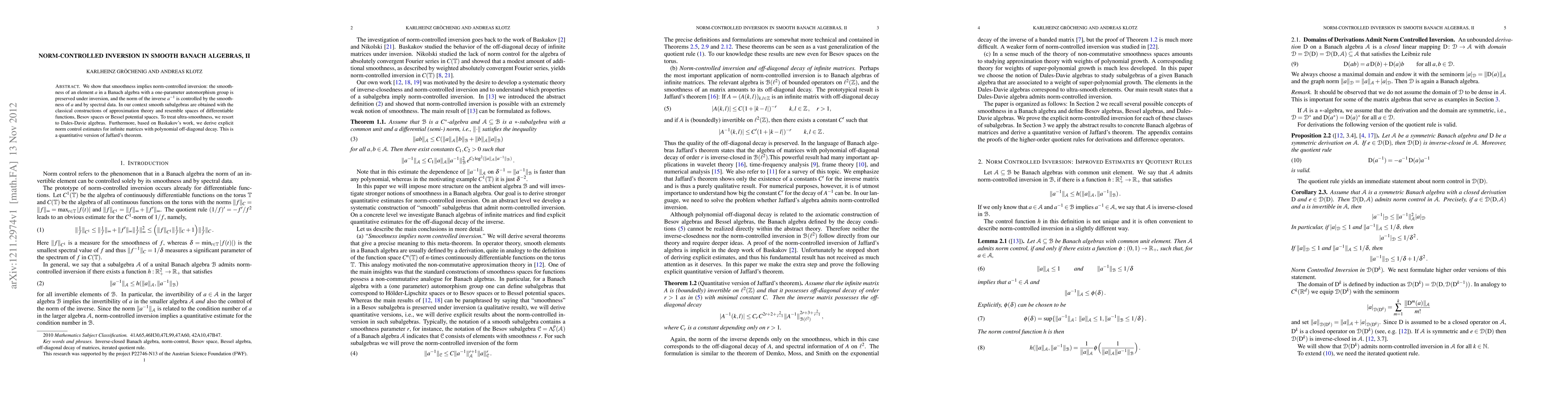 This paper demonstrates that smoothness in Banach algebras with a one-parameter automorphism group is preserved under inversion, with the norm of the inverse controlled by the smoothness of the original element and spectral data. It also provides explicit norm control estimates for infinite matrices using Dales-Davie algebras and extends Jaffard's theorem quantitatively.