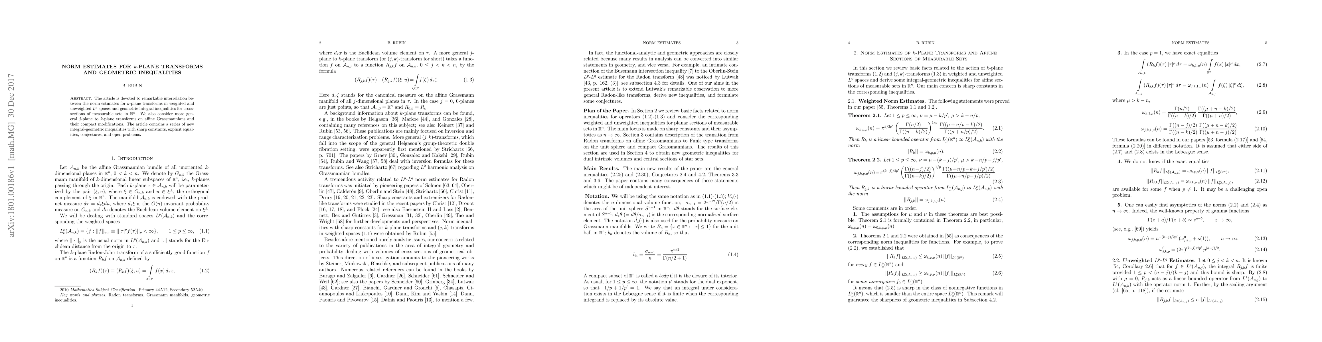 The paper presents novel norm estimate theorems for k-plane transforms and establishes connections with geometric inequalities, providing a deeper understanding of integral-geometric transformations.