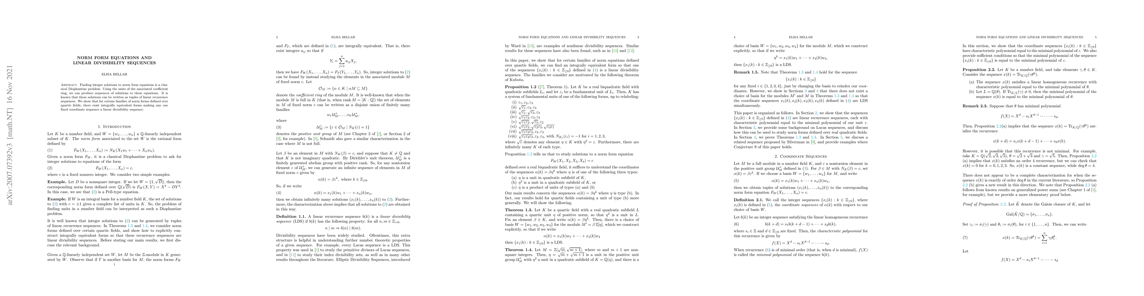 This paper explores the classical Diophantine problem of finding integer solutions to norm form equations, demonstrating that these solutions can be expressed as tuples of linear recurrence sequences. It reveals that for specific quartic fields, certain norm forms allow one fixed coordinate to form a linear divisibility sequence.