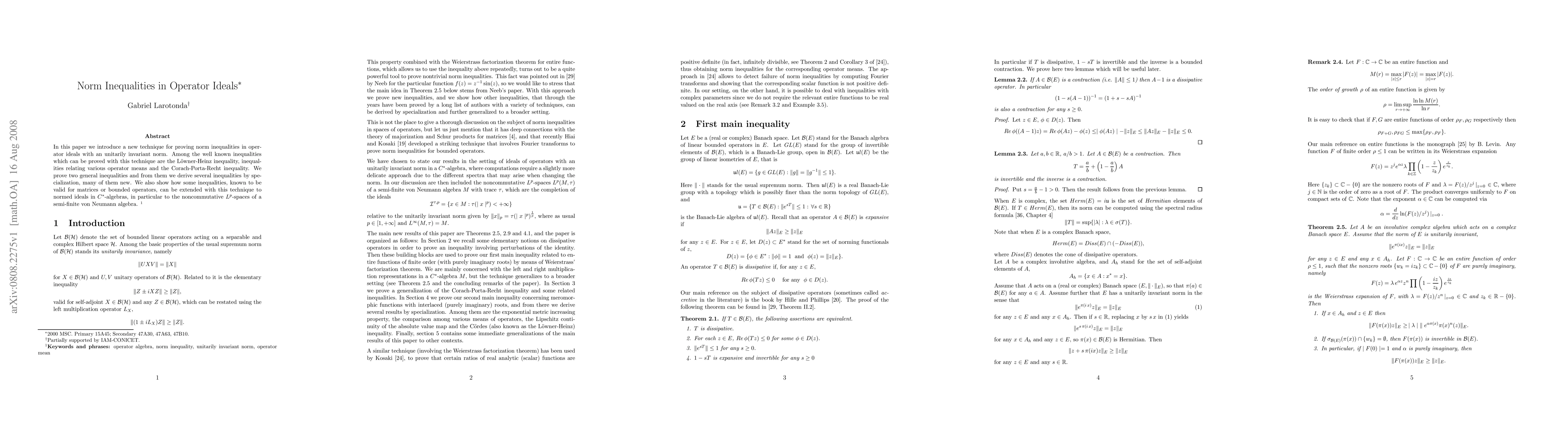In this paper we introduce a new technique for proving norm inequalities in operator ideals with an unitarily invariant norm. Among the well known inequalities which can be proved with this technique are the L\"owner-Heinz inequality, inequalities relating various operator means and the Corach-Porta-Recht inequality. We prove two general inequalities and from them we derive several inequalities by specialization, many of them new. We also show how some inequalities, known to be valid for matrices or bounded operators, can be extended with this technique to normed ideals in $C^*$-algebras, in particular to the noncommutative $L^p$-spaces of a semi-finite von Neumann algebra.