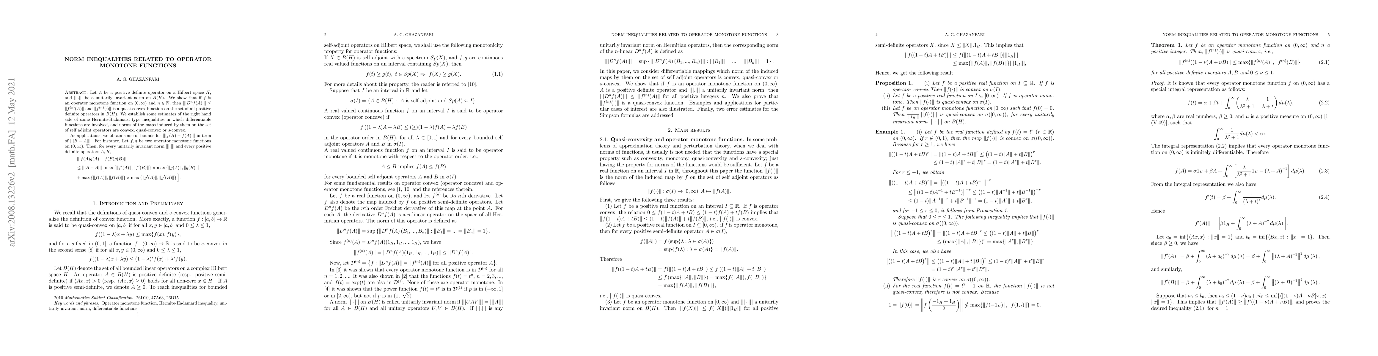 Let $A$ be a positive definite operator on a Hilbert space $H$, and $|||.|||$ be a unitarily invariant norm on $B(H)$. We show that if $f$ is an operator monotone function on $(0,\infty)$ and $n\in \mathbb{N}$, then $|||D^n f(A)|||\leq\|f^{(n)}(A)\|$ and $\|f^{(n)}(\cdot)\|$ is a quasi-convex function on the set of all positive definite operators in $B(H)$. We establish some estimates of the right hand side of some Hermite-Hadamard type inequalities in which differentiable functions are involved, and norms of the maps induced by them on the set of self adjoint operators are convex, quasi-convex or $s$-convex. As applications, we obtain some of bounds for $|||f(B)-f(A)|||$ in term of $|||B-A|||$. For instance, Let $f,g$ be two operator monotone functions on $(0,\infty)$. Then, for every unitarily invariant norm $|||.|||$ and every positive definite operators $A,B$, \begin{align*} &\left|\left|\left|f(A)g(A)-f(B)g(B)\right|\right|\right|\notag\\ &\leq|||B-A|||\Big[\max\left\{\|f'(A)\|,\|f'(B)\|\right\}\times\max\left\{\|g(A)\|,\|g(B)\|\right\}\notag\\ &+\max\left\{\|f(A)\|,\|f(B)\|\right\}\times \max\left\{\|g'(A)\|,\|g'(B)\|\right\}\Big]. \end{align*}