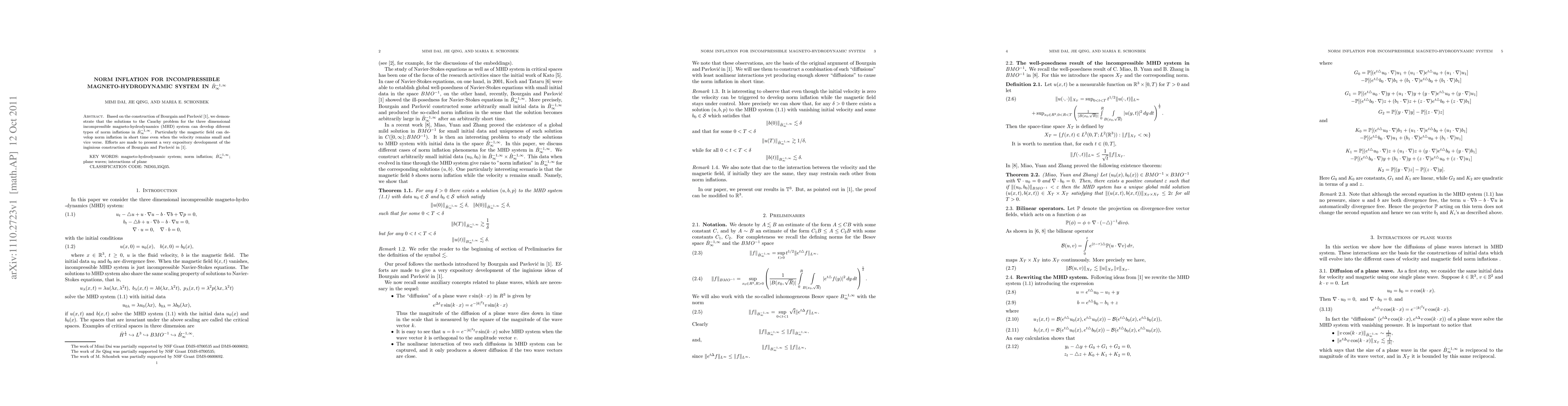 We demonstrate that the solutions to the Cauchy problem for the three dimensional incompressible magneto-hydrodynamics (MHD) system can develop diferent types of norm inflations in $\dot{B}_{\infty}^{-1, \infty}$. Particularly the magnetic field can develop norm inflation in short time even when the velocity remains small and vice verse. Efforts are made to present a very expository development of the inginious construction of Bourgain and Pavlovi\'{c} for Navier-Stokes equations.