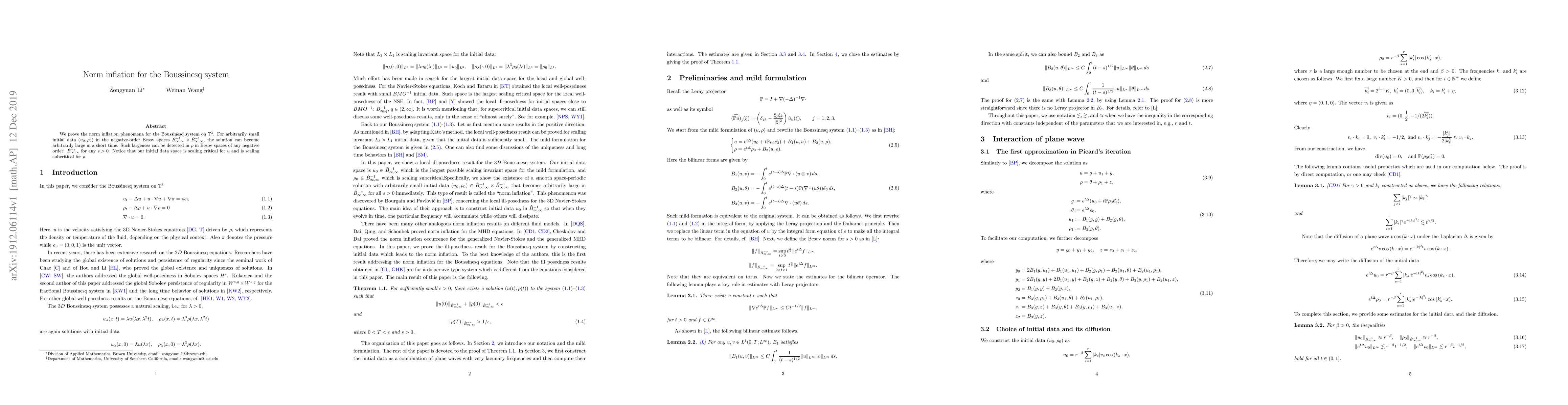 This paper proves norm inflation for the Boussinesq system on $\mathbb{T}^3$, showing that small initial data can lead to arbitrarily large solutions in short time. The phenomenon is detectable in density $\rho$ across any negative-order Besov space.
