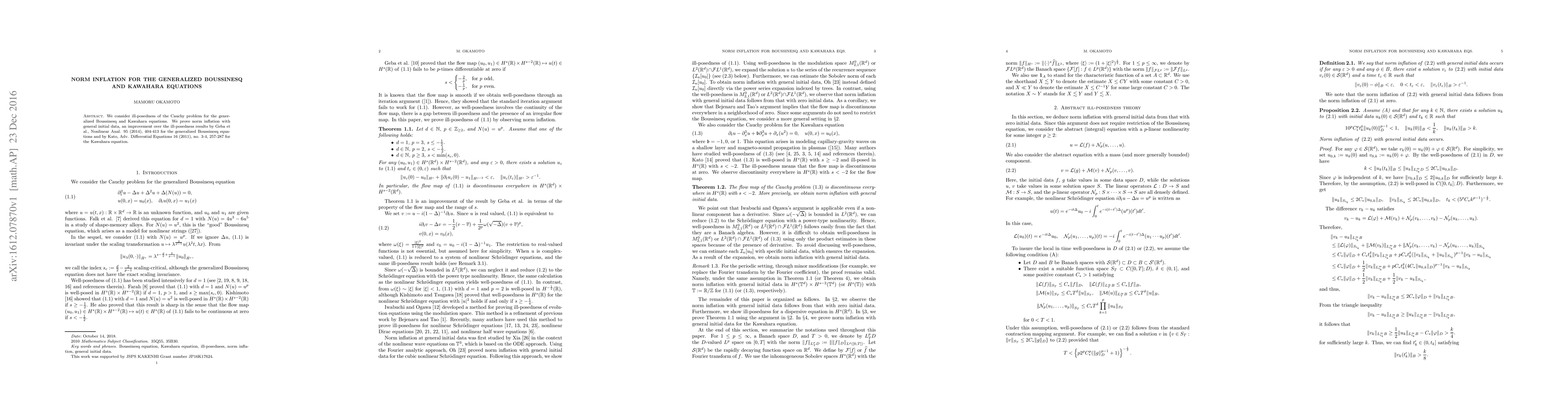 This paper investigates the ill-posedness of the Cauchy problem for the generalized Boussinesq and Kawahara equations, proving norm inflation for general initial data, which improves upon previous results by Geba et al. and Kato.
