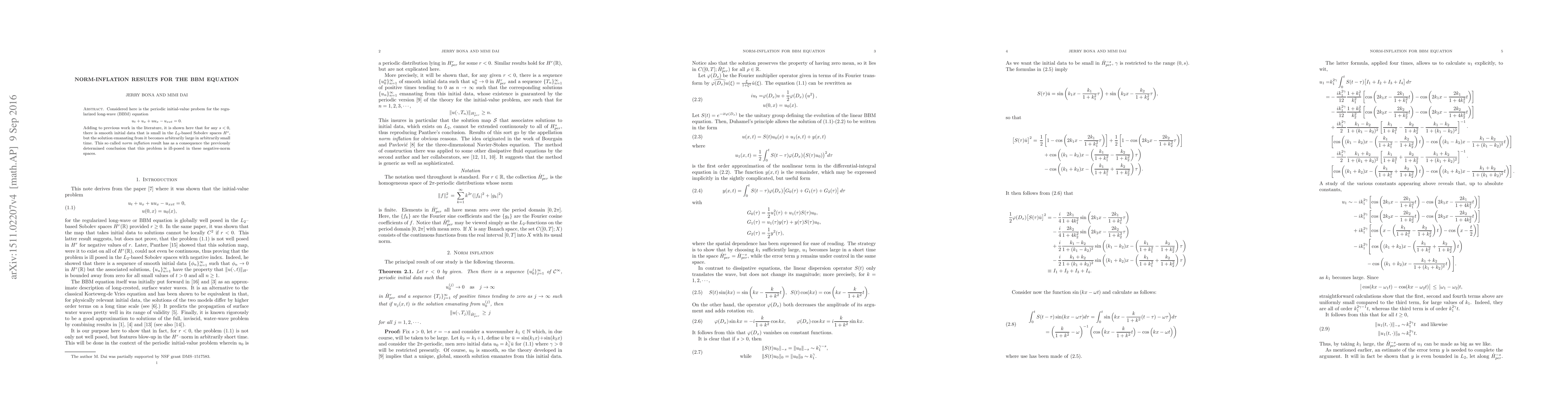 The BBM equation is shown to exhibit norm inflation for negative-norm spaces, meaning small initial data can lead to arbitrarily large solutions in short time, making the problem ill-posed.