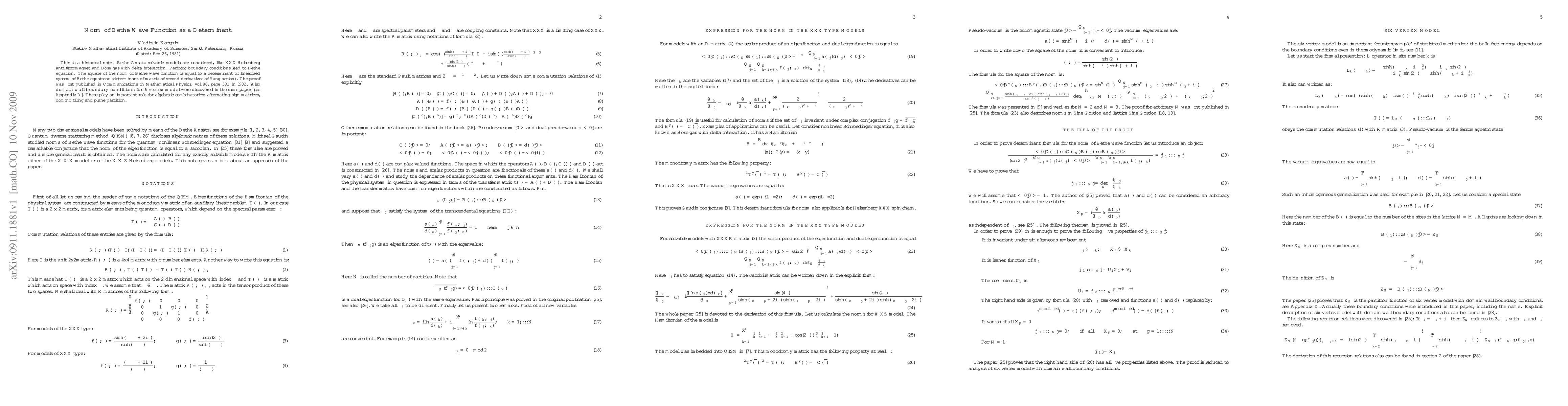 This is a historical note. Bethe Ansatz solvable models are considered, for example XXZ Heisenberg anti-ferromagnet and Bose gas with delta interaction. Periodic boundary conditions lead to Bethe equation. The square of the norm of Bethe wave function is equal to a determinant of linearized system of Bethe equations (determinant of matrix of second derivatives of Yang action). The proof was first published in Communications in Mathematical Physics, vol 86, page 391 in l982. Also domain wall boundary conditions for 6 vertex model were discovered in the same paper [see Appendix D]. These play an important role for algebraic combinatorics: alternating sign matrices, domino tiling and plane partition. Many publications are devoted to six vertex model with domain wall boundary conditions.