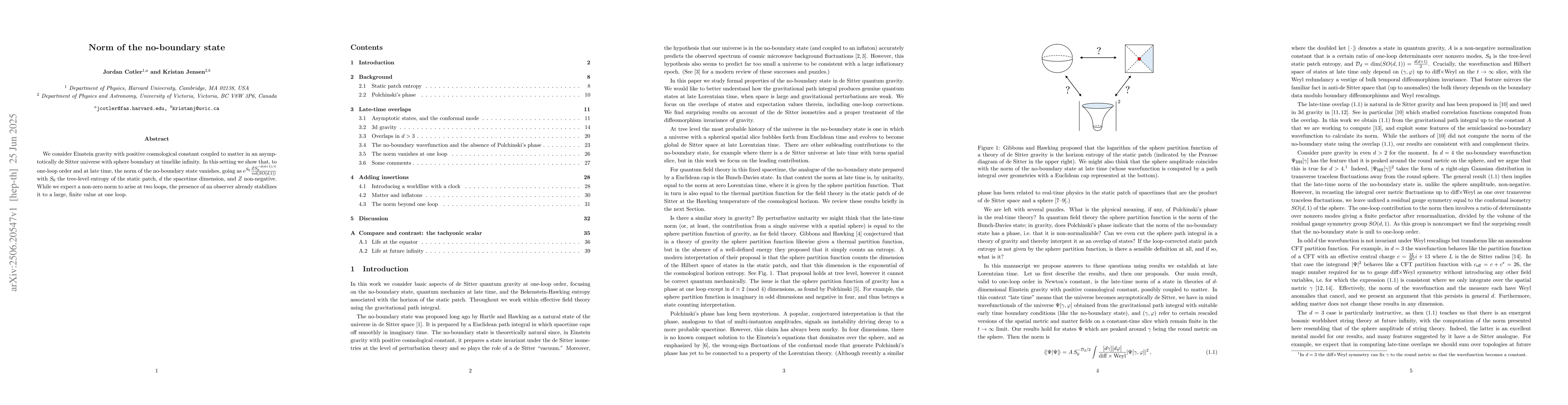 We consider Einstein gravity with positive cosmological constant coupled to matter in an asymptotically de Sitter universe with sphere boundary at timelike infinity. In this setting we show that, to one-loop order and at late time, the norm of the no-boundary state vanishes, going as $ e^{S_0} \frac{Z S_0^{-d(d+1)/4}}{\text{vol}(SO(d,1))}$ with $S_0$ the tree-level entropy of the static patch, $d$ the spacetime dimension, and $Z$ non-negative. While we expect a non-zero norm to arise at two loops, the presence of an observer already stabilizes it to a large, finite value at one loop.