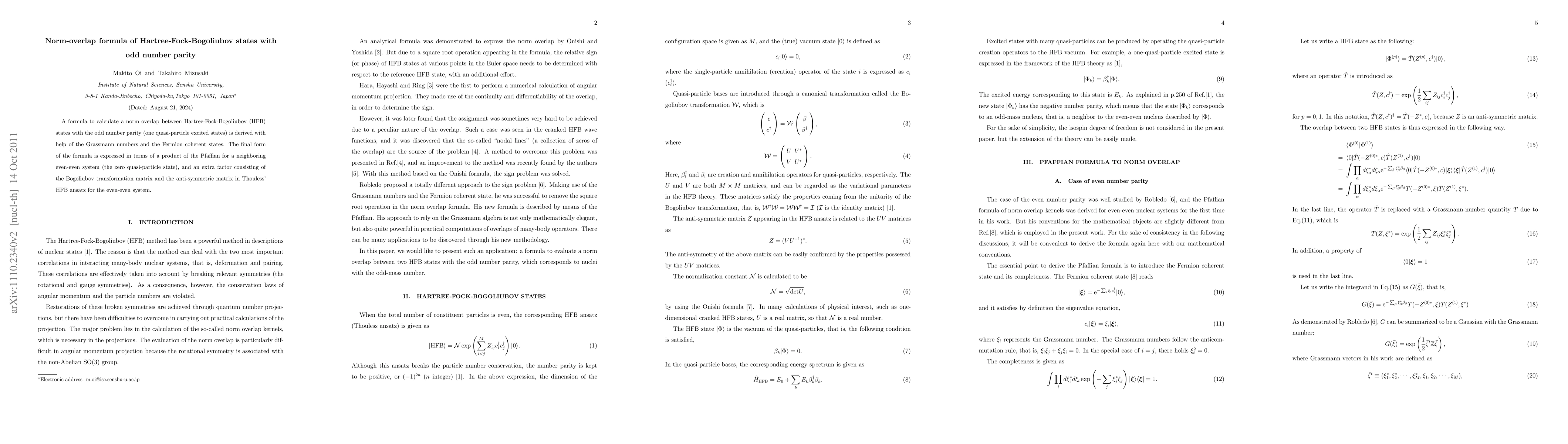The paper derives a formula for calculating the norm overlap between Hartree-Fock-Bogoliubov states with odd parity, using Grassmann numbers and Fermion coherent states. The final expression involves a product of the Pfaffian of an even-even system and an additional factor from the Bogoliubov transformation matrix and an anti-symmetric matrix.