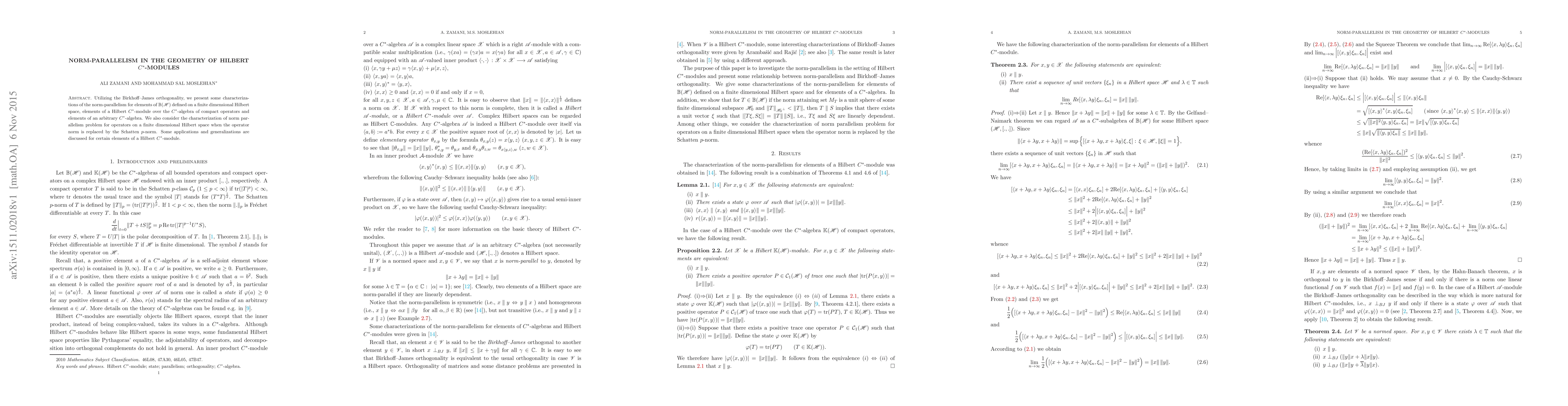 This paper explores norm-parallelism in Hilbert $C^*$-modules using Birkhoff-James orthogonality, characterizing norm-parallel elements in various operator spaces and discussing applications to finite-dimensional Hilbert spaces with Schatten $p$-norm. It also generalizes findings to specific Hilbert $C^*$-module elements.