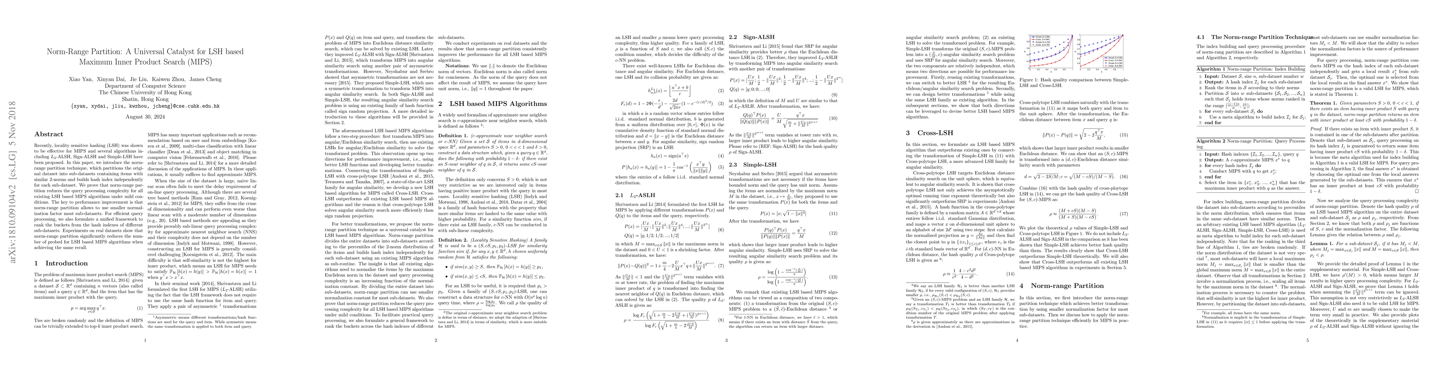 This paper introduces the norm-range partition technique to enhance locality sensitive hashing (LSH) for maximum inner product search (MIPS). By partitioning datasets into sub-datasets with similar 2-norms, it reduces query processing complexity and allows for smaller normalization factors, significantly improving performance.