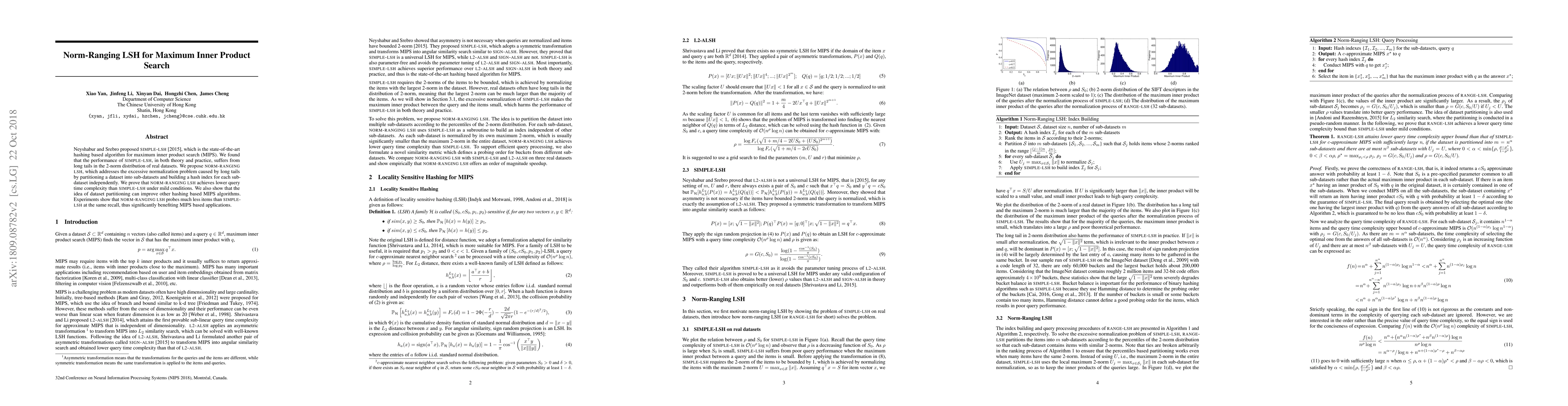 This paper proposes Norm-ranging LSH to improve maximum inner product search (MIPS) by addressing the performance issues of Simple-LSH due to long tails in the 2-norm distribution. It achieves lower query time complexity and significantly faster query processing through dataset partitioning and a novel similarity metric.