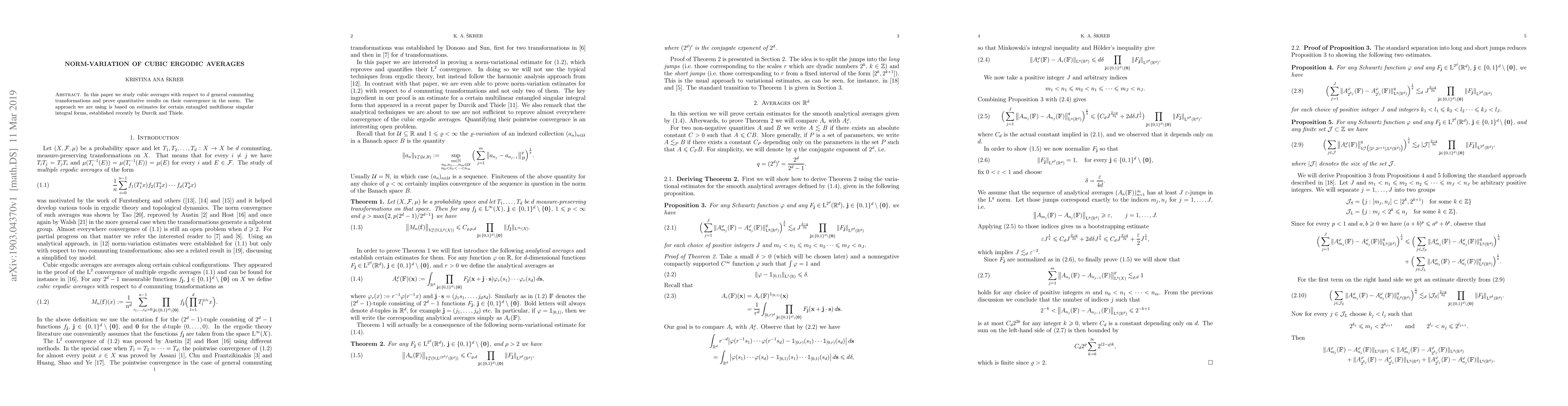 In this paper we study cubic averages with respect to $d$ general commuting transformations and prove quantitative results on their convergence in the norm. The approach we are using is based on estimates for certain entangled multilinear singular integral forms, established recently by Durcik and Thiele.