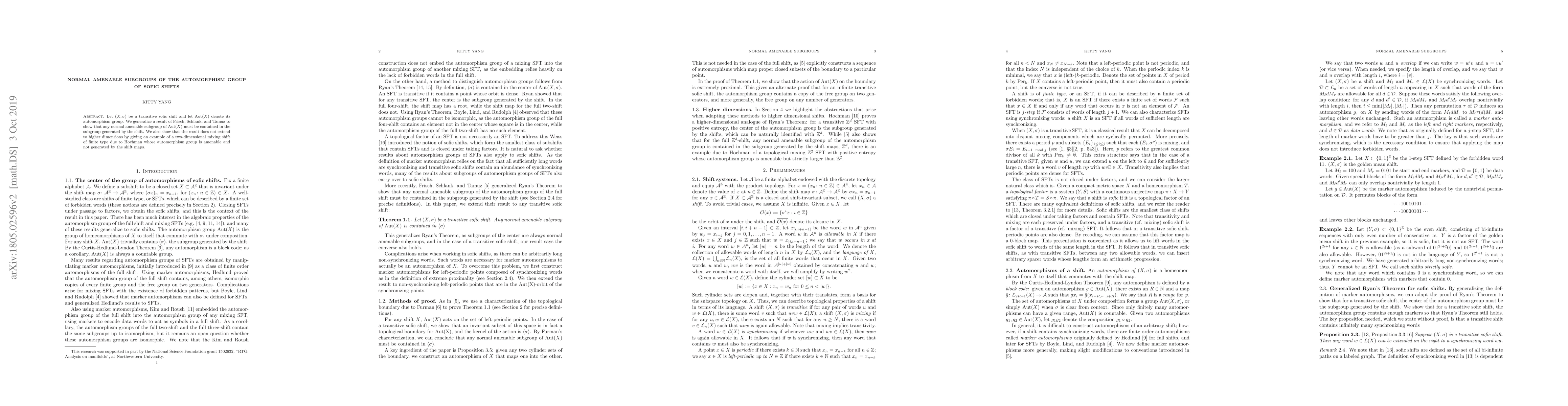 This paper shows that in a transitive sofic shift, any normal amenable subgroup of its automorphism group is contained within the subgroup generated by the shift itself. It also provides an example of a two-dimensional mixing shift that contradicts this generalization.