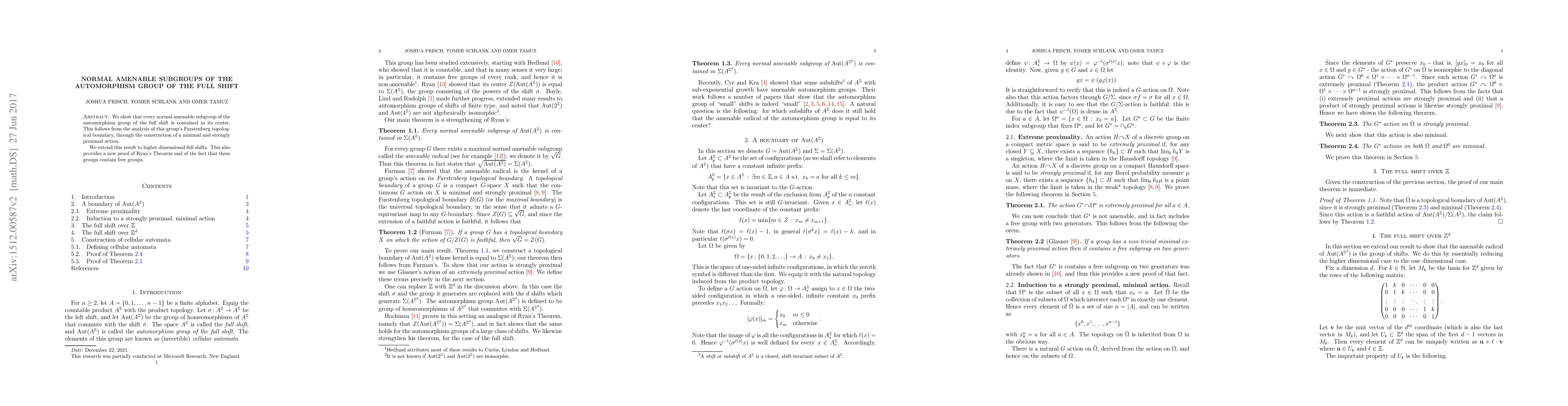 This paper demonstrates that any normal amenable subgroup within the automorphism group of the full shift is contained within its center, achieved through the examination of the group's Furstenberg topological boundary and a minimal, strongly proximal action. The findings are extended to higher dimensional full shifts, offering a new proof of Ryan's Theorem and confirming the presence of free groups in these groups.