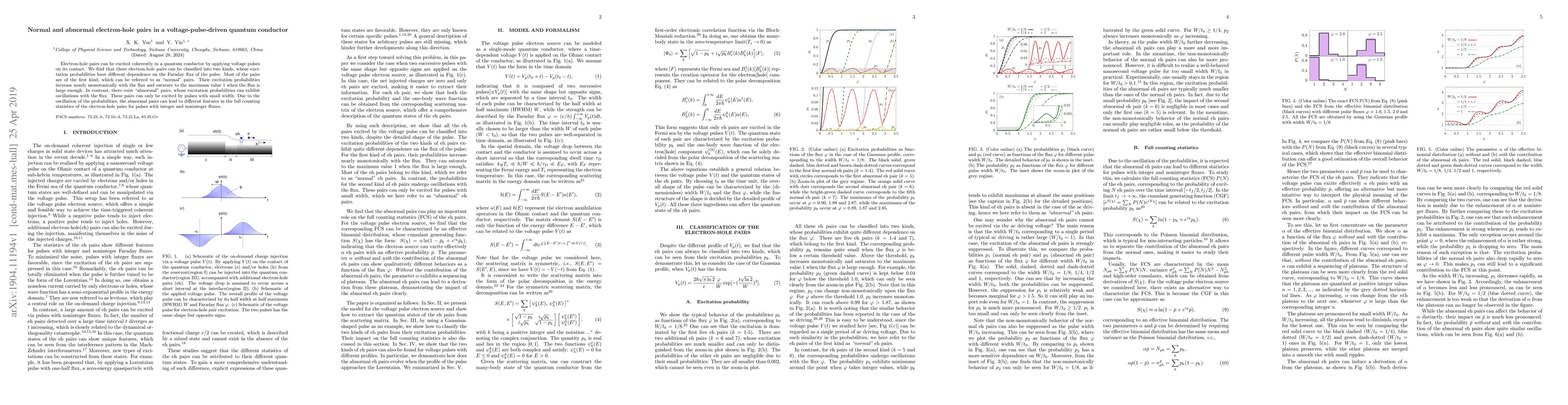 Electron-hole pairs can be excited coherently in a quantum conductor by applying voltage pulses on its contact. We find that these electron-hole pairs can be classified into two kinds, whose excitation probabilities have different dependence on the Faraday flux of the pulse. Most of the pairs are of the first kind, which can be referred to as "normal" pairs. Their excitation probabilities increase nearly monotonically with the flux and saturate to the maximum value 1 when the flux is large enough. In contrast, there exist "abnormal" pairs, whose excitation probabilities can exhibit oscillations with the flux. These pairs can only be excited by pulses with small width. Due to the oscillation of the probabilities, the abnormal pairs can lead to different features in the full counting statistics of the electron-hole pairs for pulses with integer and noninteger fluxes.