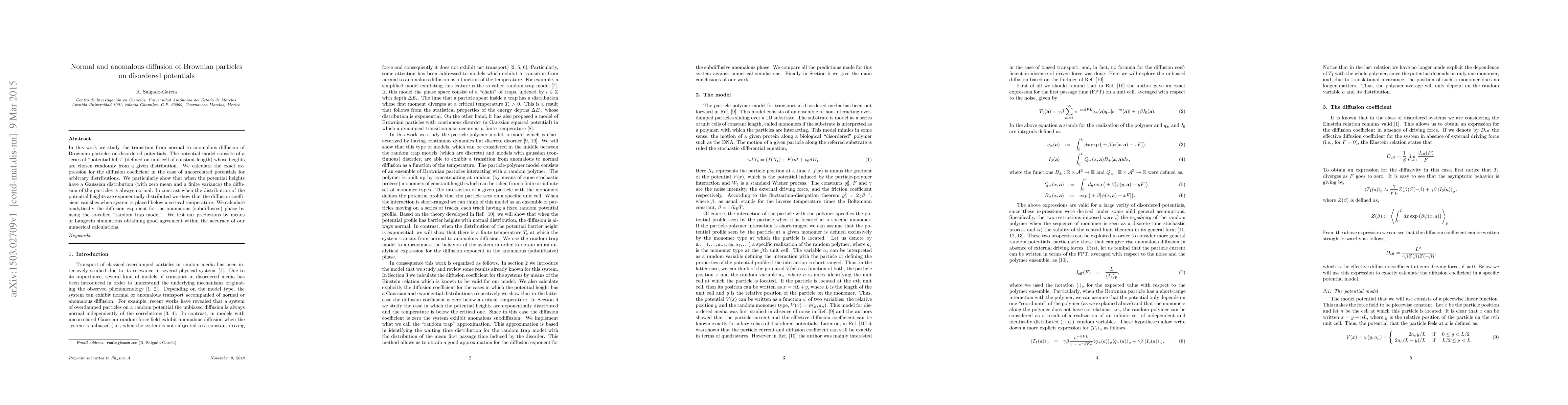 This paper investigates the transition from normal to anomalous diffusion of Brownian particles on disordered potential landscapes, finding that normal diffusion occurs with Gaussian potential distributions, while anomalous diffusion emerges with exponentially distributed potentials, characterized by a vanishing diffusion coefficient below a critical temperature. Analytical results are validated through Langevin simulations.