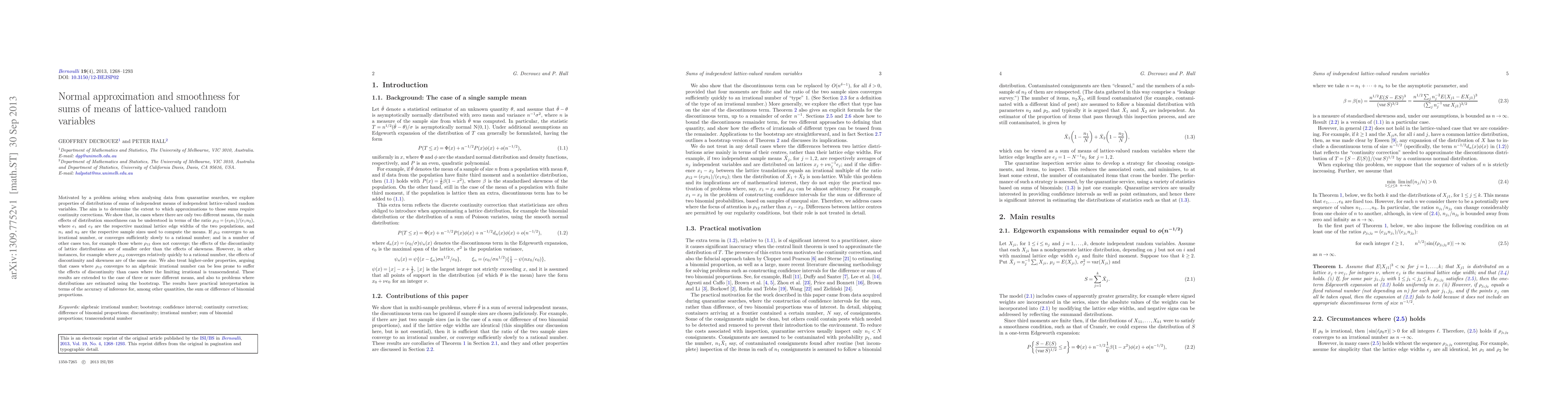 Motivated by a problem arising when analysing data from quarantine searches, we explore properties of distributions of sums of independent means of independent lattice-valued random variables. The aim is to determine the extent to which approximations to those sums require continuity corrections. We show that, in cases where there are only two different means, the main effects of distribution smoothness can be understood in terms of the ratio $\rho_{12}=(e_2n_1)/(e_1n_2)$, where $e_1$ and $e_2$ are the respective maximal lattice edge widths of the two populations, and $n_1$ and $n_2$ are the respective sample sizes used to compute the means. If $\rho_{12}$ converges to an irrational number, or converges sufficiently slowly to a rational number; and in a number of other cases too, for example those where $\rho_{12}$ does not converge; the effects of the discontinuity of lattice distributions are of smaller order than the effects of skewness. However, in other instances, for example where $\rho_{12}$ converges relatively quickly to a rational number, the effects of discontinuity and skewness are of the same size. We also treat higher-order properties, arguing that cases where $\rho_{12}$ converges to an algebraic irrational number can be less prone to suffer the effects of discontinuity than cases where the limiting irrational is transcendental. These results are extended to the case of three or more different means, and also to problems where distributions are estimated using the bootstrap. The results have practical interpretation in terms of the accuracy of inference for, among other quantities, the sum or difference of binomial proportions.