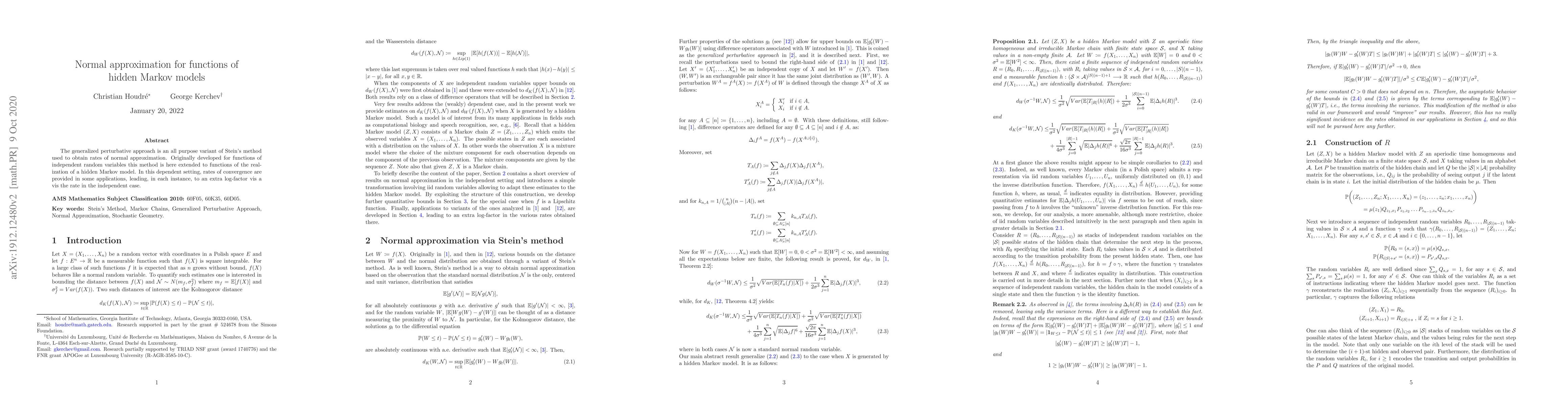 The generalized perturbative approach is an all purpose variant of Stein's method used to obtain rates of normal approximation. Originally developed for functions of independent random variables this method is here extended to functions of the realization of a hidden Markov model. In this dependent setting, rates of convergence are provided in some applications to stochastic geometry, leading, in each instance, to an extra log-factor vis a vis the rate in the independent case.