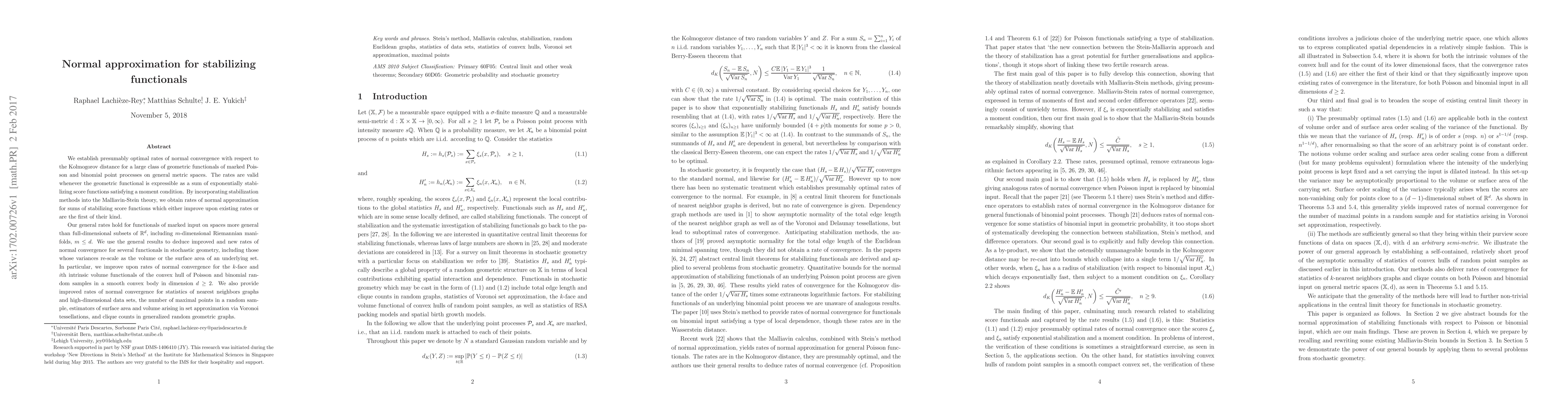 We establish presumably optimal rates of normal convergence with respect to the Kolmogorov distance for a large class of geometric functionals of marked Poisson and binomial point processes on general metric spaces. The rates are valid whenever the geometric functional is expressible as a sum of exponentially stabilizing score functions satisfying a moment condition. By incorporating stabilization methods into the Malliavin-Stein theory, we obtain rates of normal approximation for sums of stabilizing score functions which either improve upon existing rates or are the first of their kind. Our general rates hold for functionals of marked input on spaces more general than full-dimensional subsets of $\mathbb{R}^d$, including $m$-dimensional Riemannian manifolds, $m\leq d$. We use the general results to deduce improved and new rates of normal convergence for several functionals in stochastic geometry, including those whose variances re-scale as the volume or the surface area of an underlying set. In particular, we improve upon rates of normal convergence for the $k$-face and $i$th intrinsic volume functionals of the convex hull of Poisson and binomial random samples in a smooth convex body in dimension $d\geq 2$. We also provide improved rates of normal convergence for statistics of nearest neighbors graphs and high-dimensional data sets, the number of maximal points in a random sample, estimators of surface area and volume arising in set approximation via Voronoi tessellations, and clique counts in generalized random geometric graphs.