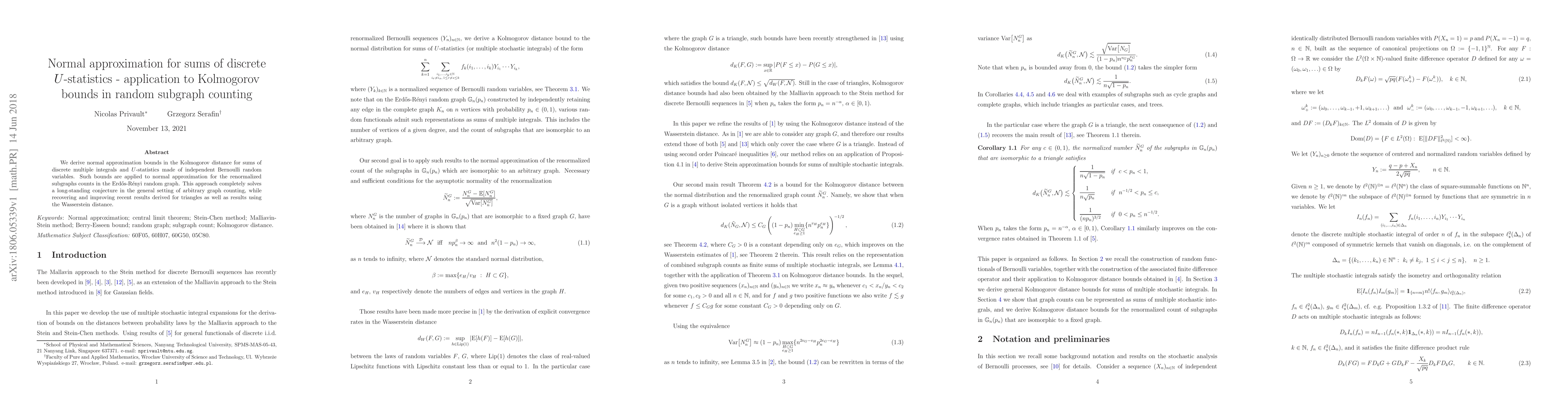Summary: This paper provides normal approximation bounds for sums of discrete multiple integrals and $U$-statistics, applying them to renormalized subgraph counts in the Erdős-Rényi random graph. It resolves a longstanding conjecture in arbitrary graph counting and improves upon recent results.