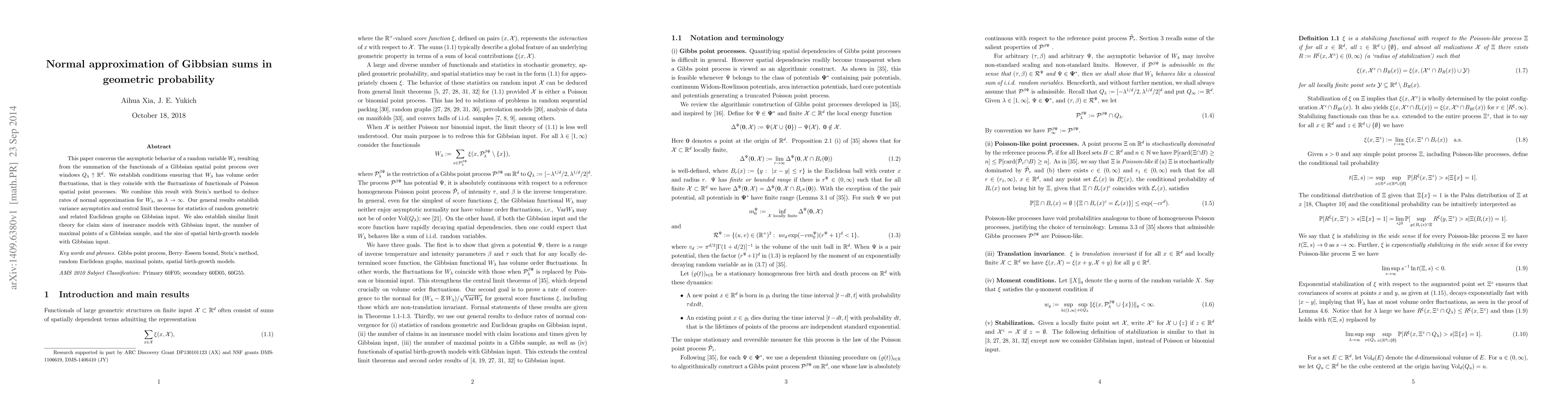 This paper investigates the asymptotic behavior of Gibbsian spatial point processes, proving conditions for normal approximation of their functionals and establishing central limit theorems for various applications, including random geometric graphs and insurance models. The results utilize Stein's method to derive rates of normal approximation for the considered statistics.