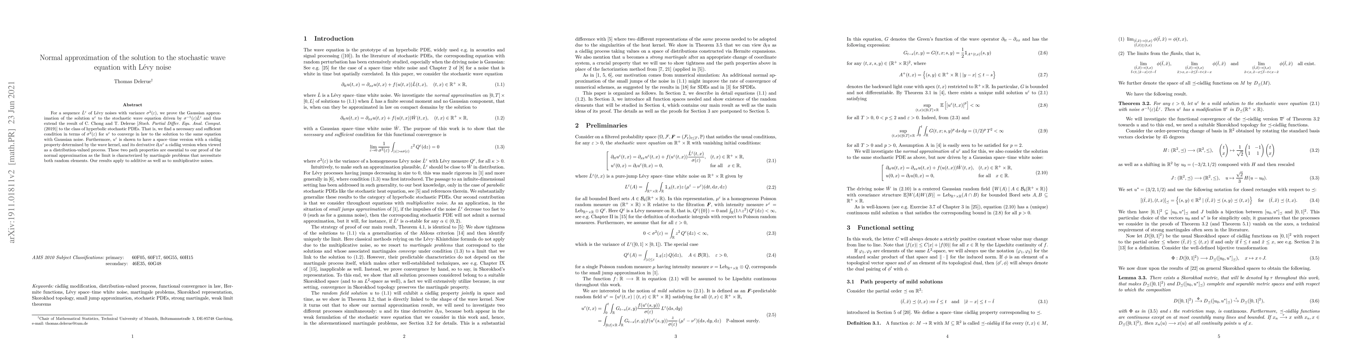For a sequence $\dot{L}^{\varepsilon}$ of L\'evy noises with variance $\sigma^2(\varepsilon)$, we prove the Gaussian approximation of the solution $u^{\varepsilon}$ to the stochastic wave equation driven by $\sigma^{-1}(\varepsilon) \dot{L}^{\varepsilon}$ and thus extend the result of C. Chong and T. Delerue [Stoch. Partial Differ. Equ. Anal. Comput. (2019)] to the class of hyperbolic stochastic PDEs. That is, we find a necessary and sufficient condition in terms of $\sigma^2(\varepsilon)$ for $u^{\varepsilon}$ to converge in law to the solution to the same equation with Gaussian noise. Furthermore, $u^{\varepsilon}$ is shown to have a space-time version with a c\`adl\`ag property determined by the wave kernel, and its derivative $\partial_t u^{\varepsilon}$ a c\`adl\`ag version when viewed as a distribution-valued process. These two path properties are essential to our proof of the normal approximation as the limit is characterized by martingale problems that necessitate both random elements. Our results apply to additive as well as to multiplicative noises.