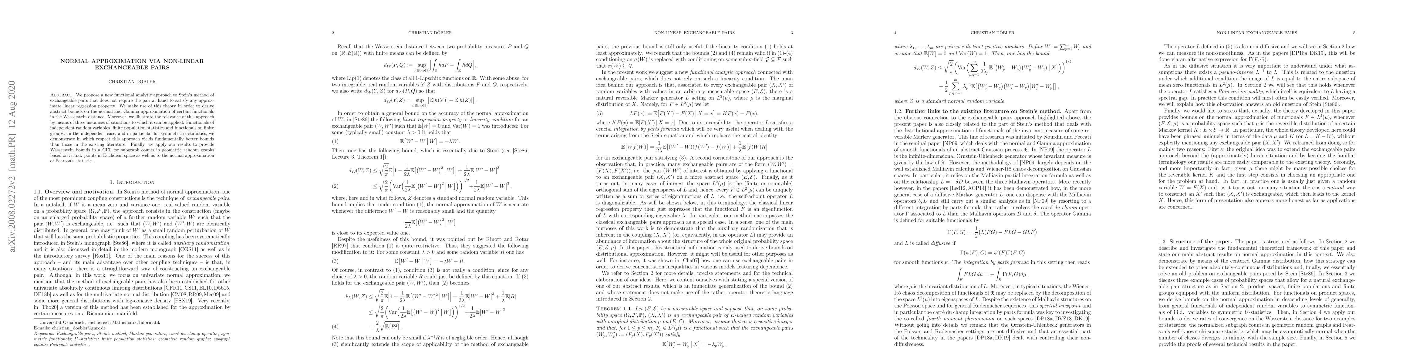 This paper introduces a novel functional analytic approach to Stein's method of exchangeable pairs, achieving normal and Gamma approximations without requiring approximate linear regression properties. It demonstrates superior bounds for symmetric $U$-statistics and applies the method to subgraph counts in geometric random graphs and the normal approximation of Pearson's statistic.