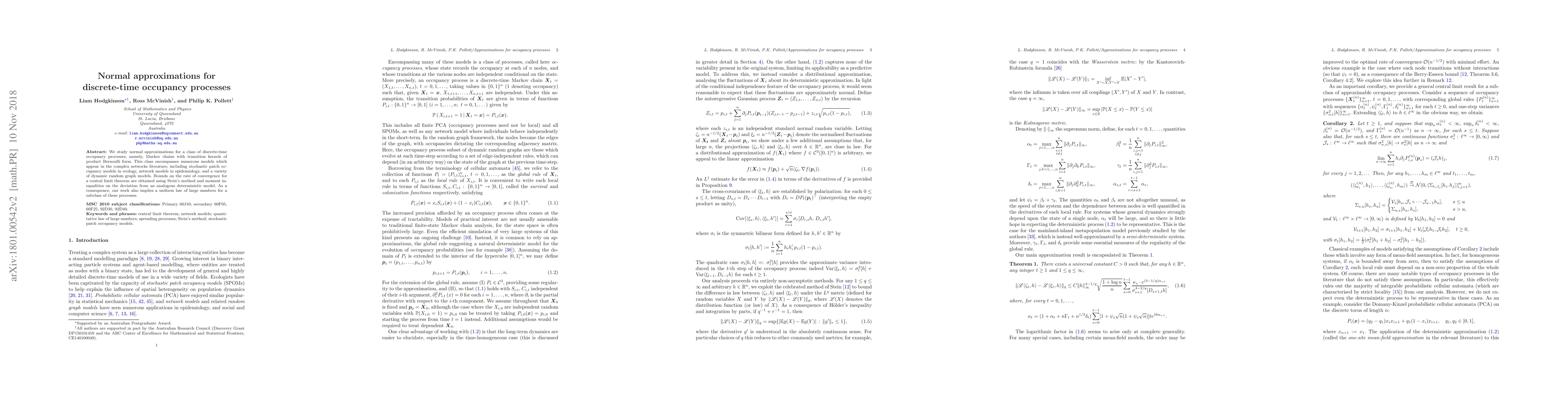 We study normal approximations for a class of discrete-time occupancy processes, namely, Markov chains with transition kernels of product Bernoulli form. This class encompasses numerous models which appear in the complex networks literature, including stochastic patch occupancy models in ecology, network models in epidemiology, and a variety of dynamic random graph models. Bounds on the rate of convergence for a central limit theorem are obtained using Stein's method and moment inequalities on the deviation from an analogous deterministic model. As a consequence, our work also implies a uniform law of large numbers for a subclass of these processes.