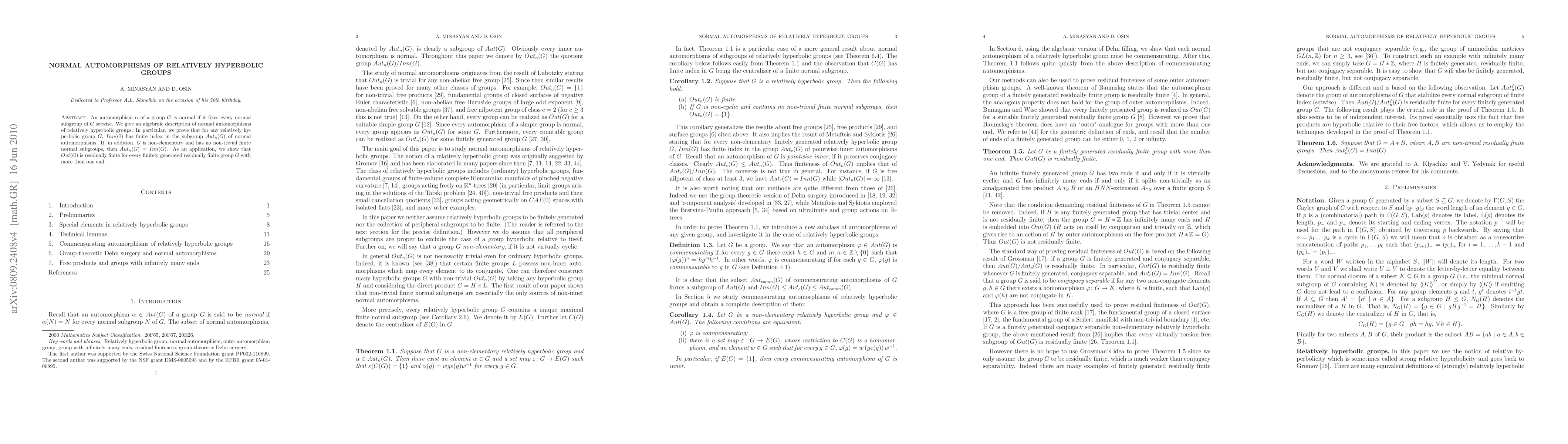 This paper provides an algebraic description of normal automorphisms in relatively hyperbolic groups, proving that the inner automorphisms have finite index within the subgroup of normal automorphisms. It further shows that for non-elementary groups without non-trivial finite normal subgroups, the normal automorphisms coincide with the inner ones, and concludes with the residual finiteness of the outer automorphism group for finitely generated residually finite groups with more than one end.