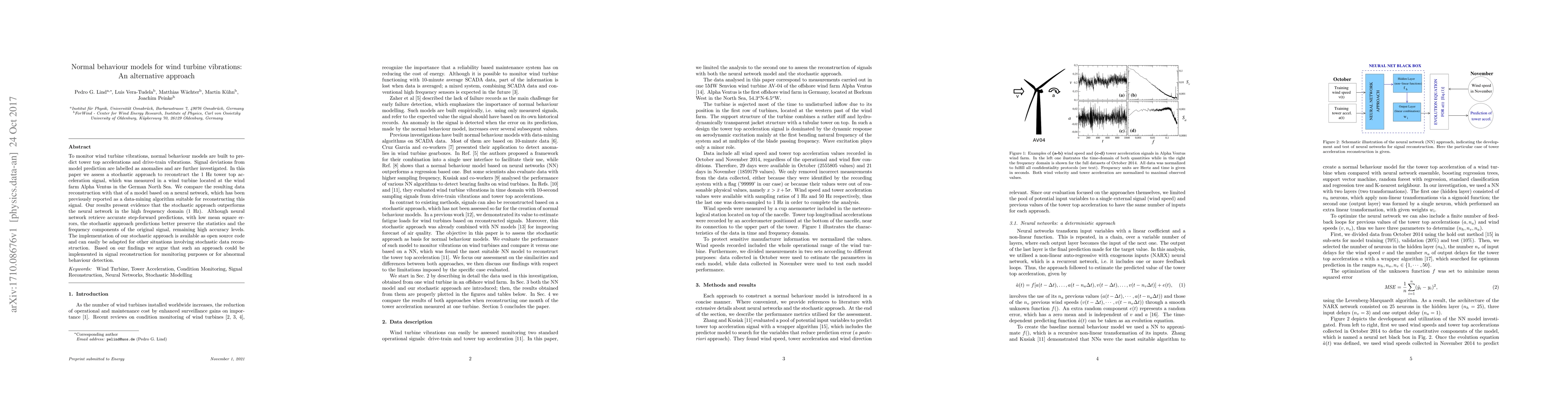 The identification of abnormal behaviour in mechanical systems is key to anticipate and avoid their potential failure. Thus wind turbine health is commonly assessed monitoring series of $10$-minute SCADA and high frequency data from sensors. To monitor wind turbine vibrations, normal behaviour models are built to predict tower top accelerations and drive-train vibrations. Signal deviations from model prediction are labelled as anomalies and are further investigated. More efficient models are expected to help enhancing the identification of abnormal behaviour. In this paper we assess a stochastic approach to reconstruct the $1$ Hz tower top acceleration signal, which was measured in a wind turbine located at the wind farm Alpha Ventus in the German North Sea. We compare the resulting data reconstruction with that of a model based on a neural network, which has been previously reported as a data-mining algorithm suitable for reconstructing this signal. In order to focus the discussion on the similarities and differences of both approaches, we limit our evaluation to a single input-output system; in doing so, we avoid other differences, i.e. loading type, pre-processing or model complexity. Our results present evidence that the stochastic approach outperforms the neural network in the high frequency domain ($1$ Hz). Although neural network retrieve accurate step-forward predictions, with low mean square errors, the stochastic approach predictions better preserve the statistics and the frequency components of the original signal, remaining high accuracy levels. The implementation of our stochastic approach is available as open source code and can easily be adapted for other situations involving stochastic data reconstruction. Based on our findings we argue that such an approach could be implemented in signal reconstruction for monitoring purposes or for abnormal behaviour detection.