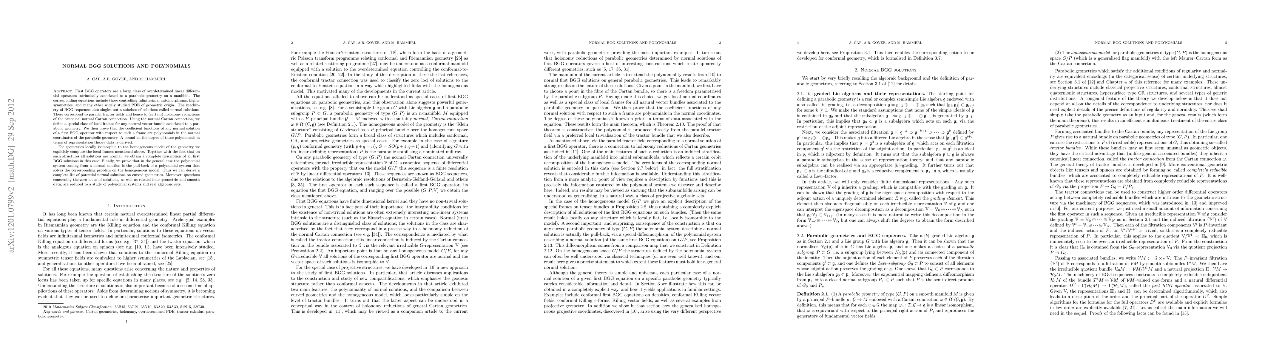 First BGG operators are a large class of overdetermined linear differential operators intrinsically associated to a parabolic geometry on a manifold. The corresponding equations include those controlling infinitesimal automorphisms, higher symmetries, and many other widely studied PDE of geometric origin. The machinery of BGG sequences also singles out a subclass of solutions called normal solutions. These correspond to parallel tractor fields and hence to (certain) holonomy reductions of the canonical normal Cartan connection. Using the normal Cartan connection, we define a special class of local frames for any natural vector bundle associated to a parabolic geometry. We then prove that the coefficient functions of any normal solution of a first BGG operator with respect to such a frame are polynomials in the normal coordinates of the parabolic geometry. A bound on the degree of these polynomials in terms of representation theory data is derived. For geometries locally isomorphic to the homogeneous model of the geometry we explicitly compute the local frames mentioned above. Together with the fact that on such structures all solutions are normal, we obtain a complete description of all first BGG solutions in this case. Finally, we prove that in the general case the polynominal system coming from a normal solution is the pull-back of a polynomial system that solves the corresponding problem on the homogeneous model. Thus we can derive a complete list of potential normal solutions on curved geometries. Morover, questions concerning the zero locus of solutions, as well as related finer geometric and smooth data, are reduced to a study of polynomial systems and real algebraic sets.
