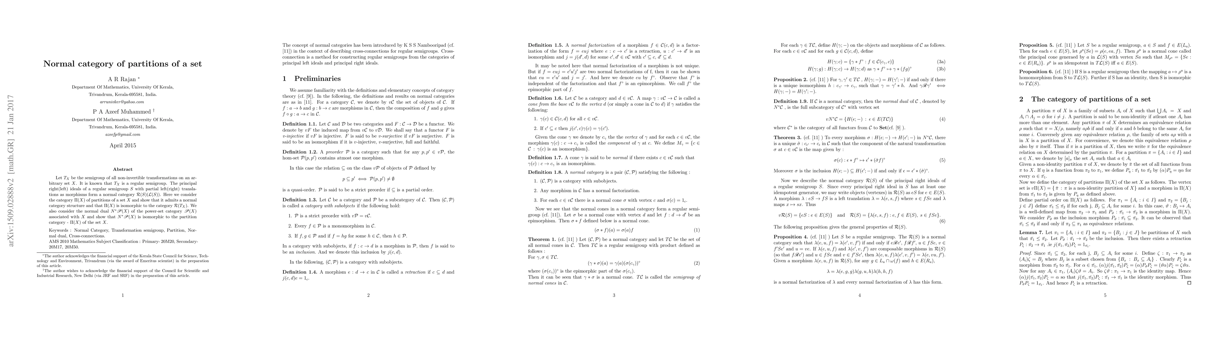 Let $T_X$ be the semigroup of all non-invertible transformations on an arbitrary set $X$. It is known that $T_X$ is a regular semigroup. The principal right(left) ideals of a regular semigroup $S$ with partial left(right) translations as morphisms form a normal category $\mathcal{R}( S )$($\mathcal{L}( S )$). Here we consider the category $\Pi(X)$ of partitions of a set $X$ and show that it admits a normal category structure and that $\Pi(X)$ is isomorphic to the category $\mathcal{R}( T_X )$. We also consider the normal dual $N^\ast \mathscr{P}(X)$ of the power-set category $\mathscr{P}(X)$ associated with $X$ and show that $N^\ast \mathscr{P}(X)$ is isomorphic to the partition category - $\Pi(X)$ of the set $X$.