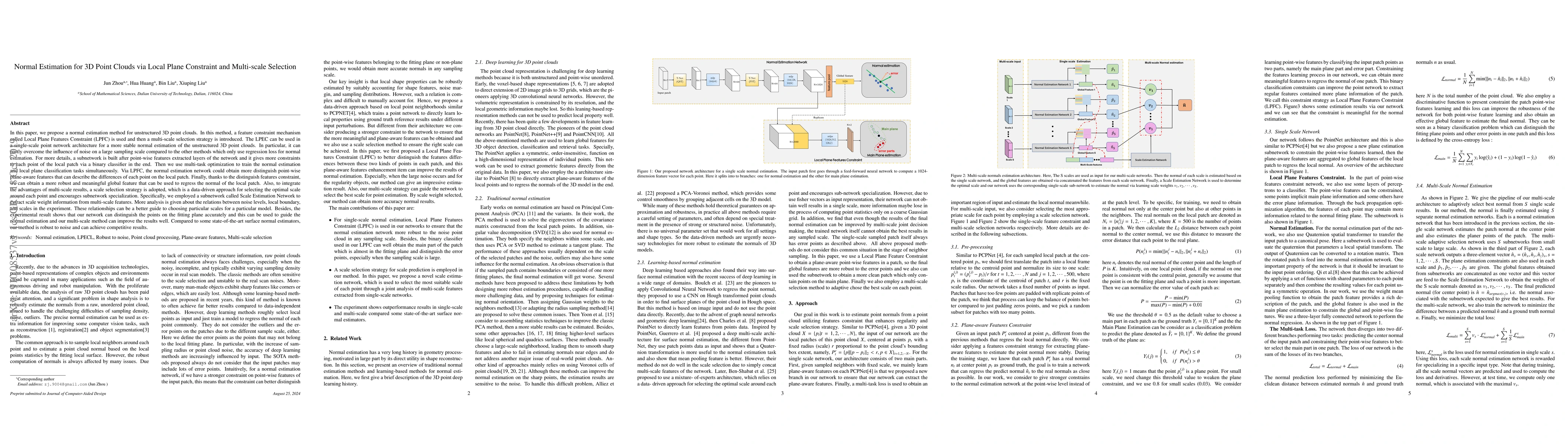This paper proposes a normal estimation method for unstructured 3D point clouds using a Local Plane Features Constraint (LPFC) and a multi-scale selection strategy. The method employs a subnetwork for local plane classification and scale estimation to achieve robust normal estimation, outperforming other regression-based methods in noise conditions.