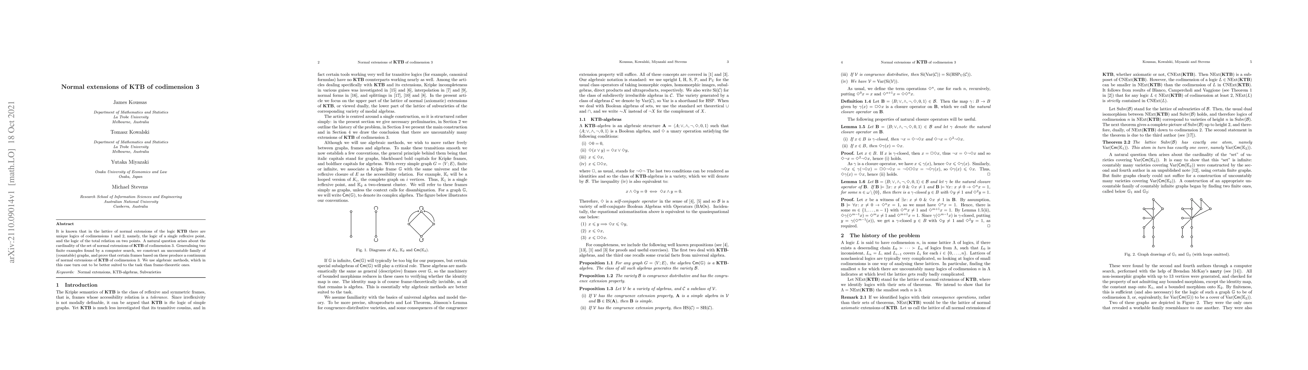 It is known that in the lattice of normal extensions of the logic KTB there are unique logics of codimensions 1 and 2, namely, the logic of a single reflexive point, and the logic of the total relation on two points. A natural question arises about the cardinality of the set of normal extensions of KTB of codimension 3. Generalising two finite examples found by a computer search, we construct an uncountable family of (countable) graphs, and prove that certain frames based on these produce a continuum of normal extensions of KTB of codimension 3. We use algebraic methods, which in this case turn out to be better suited to the task than frame-theoretic ones.