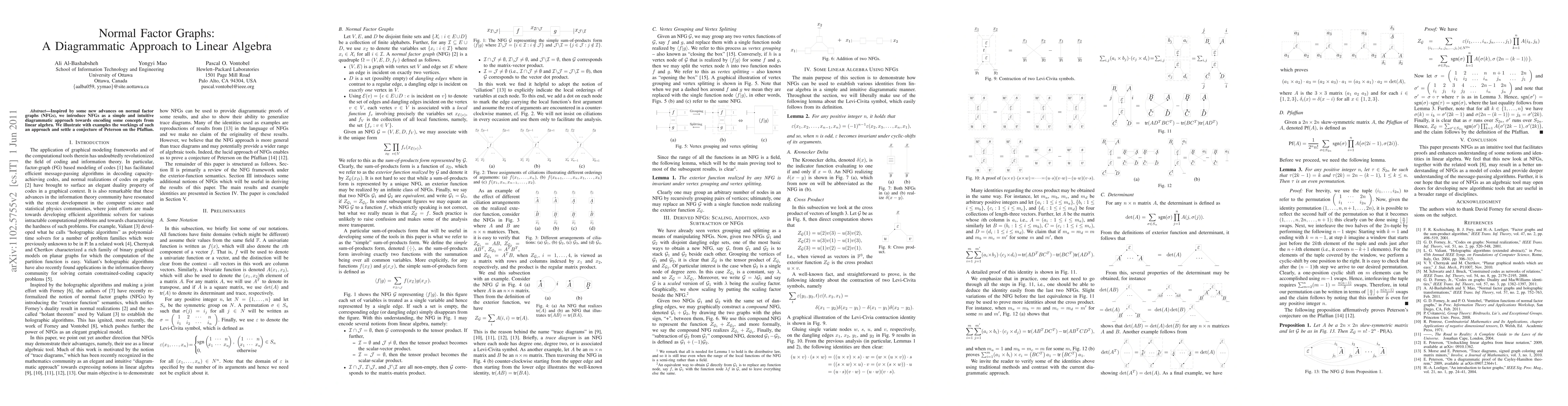 Summary: This paper introduces normal factor graphs (NFGs) as a diagrammatic method to represent linear algebra concepts, providing a simple and intuitive framework. It also resolves a conjecture by Peterson regarding the Pfaffian through this new approach.