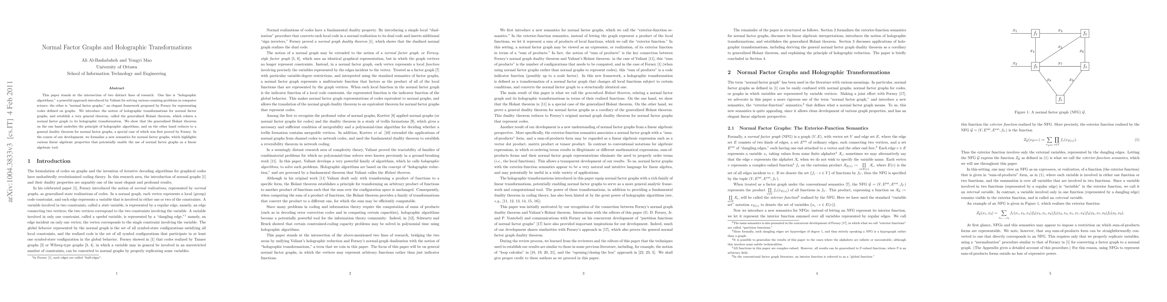 This paper bridges "holographic algorithms" and "normal factor graphs," introducing holographic transformations for the latter and establishing a generalized Holant theorem that connects them. The new semantics for normal factor graphs reveal linear algebraic properties, suggesting their potential as a linear algebraic tool.