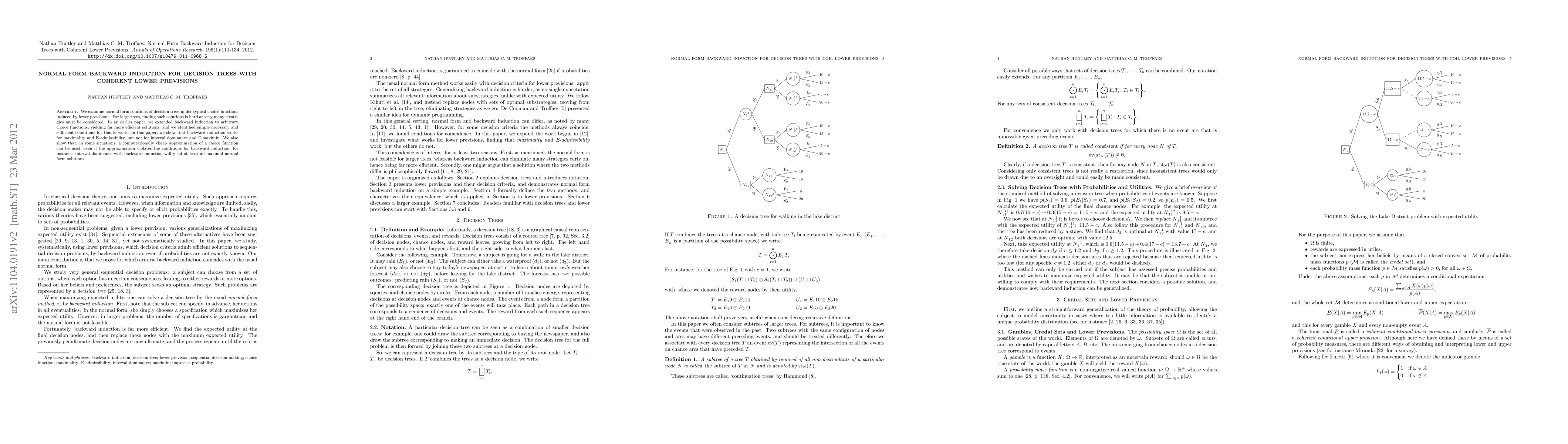 Researchers explore how backward induction works for decision trees under different choice functions, finding it effective for maximality and E-admissibility but not interval dominance and Gamma-maximin.
