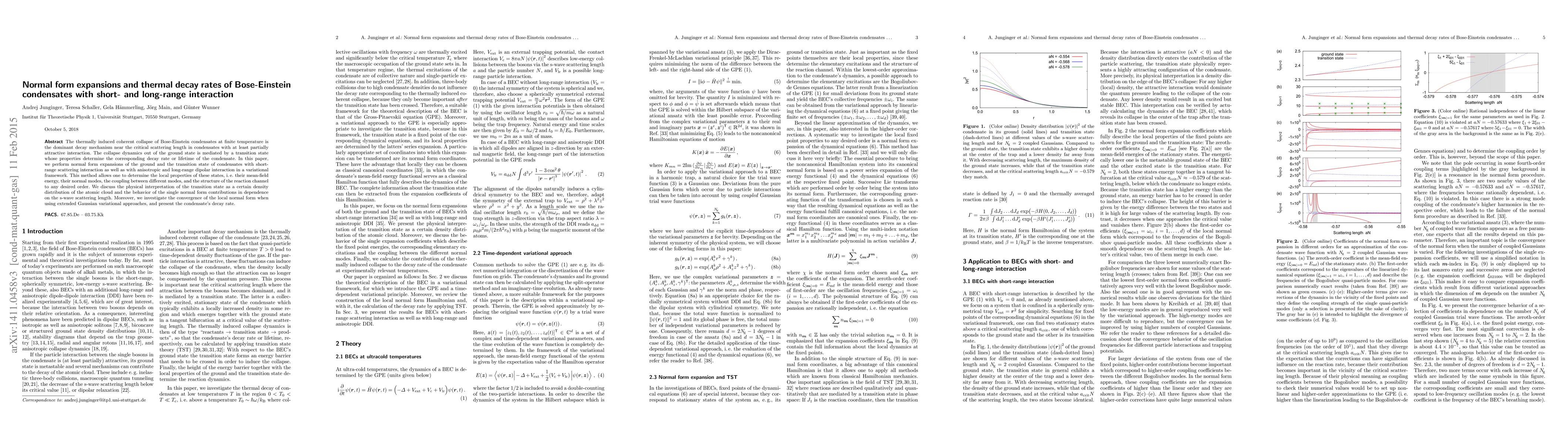 The thermally induced coherent collapse of Bose-Einstein condensates at finite temperature is the dominant decay mechanism near the critical scattering length in condensates with at least partially attractive interaction. The collapse dynamics out of the ground state is mediated by a transition state whose properties determine the corresponding decay rate or lifetime of the condensate. In this paper, we perform normal form expansions of the ground and the transition state of condensates with short-range scattering interaction as well as with anisotropic and long-range dipolar interaction in a variational framework. This method allows one to determine the local properties of these states, i.e. their mean-field energy, their normal modes, the coupling between different modes, and the structure of the reaction channel to any desired order. We discuss the physical interpretation of the transition state as a certain density distribution of the atomic cloud and the behavior of the single normal form contributions in dependence on the s-wave scattering length. Moreover, we investigate the convergence of the local normal form when using extended Gaussian variational approaches, and present the condensate's decay rate.