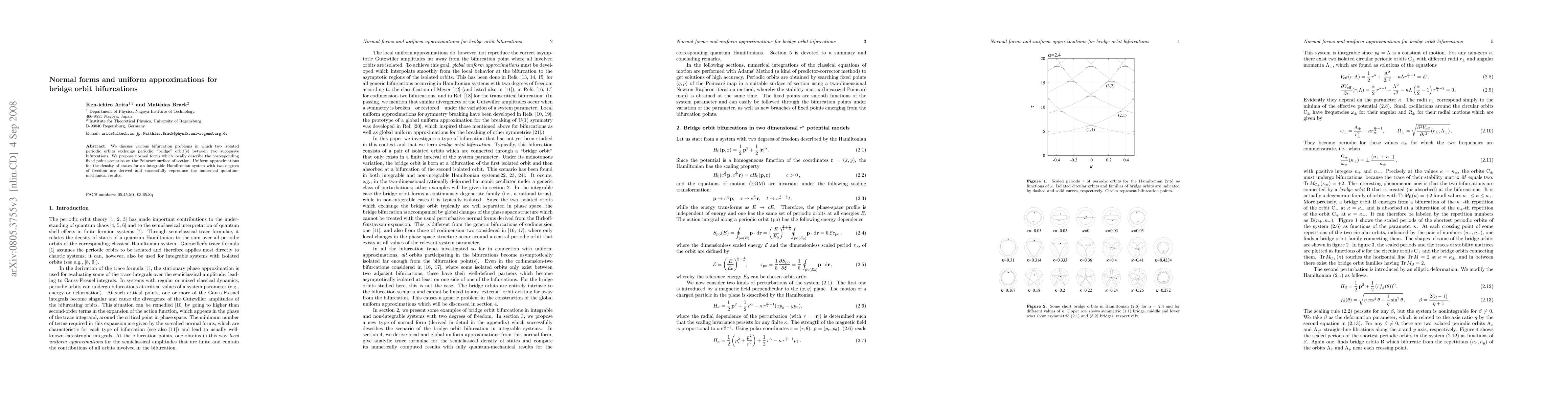 We discuss various bifurcation problems in which two isolated periodic orbits exchange periodic ``bridge'' orbit(s) between two successive bifurcations. We propose normal forms which locally describe the corresponding fixed point scenarios on the Poincar\'e surface of section. Uniform approximations for the density of states for an integrable Hamiltonian system with two degrees of freedom are derived and successfully reproduce the numerical quantum-mechanical results.