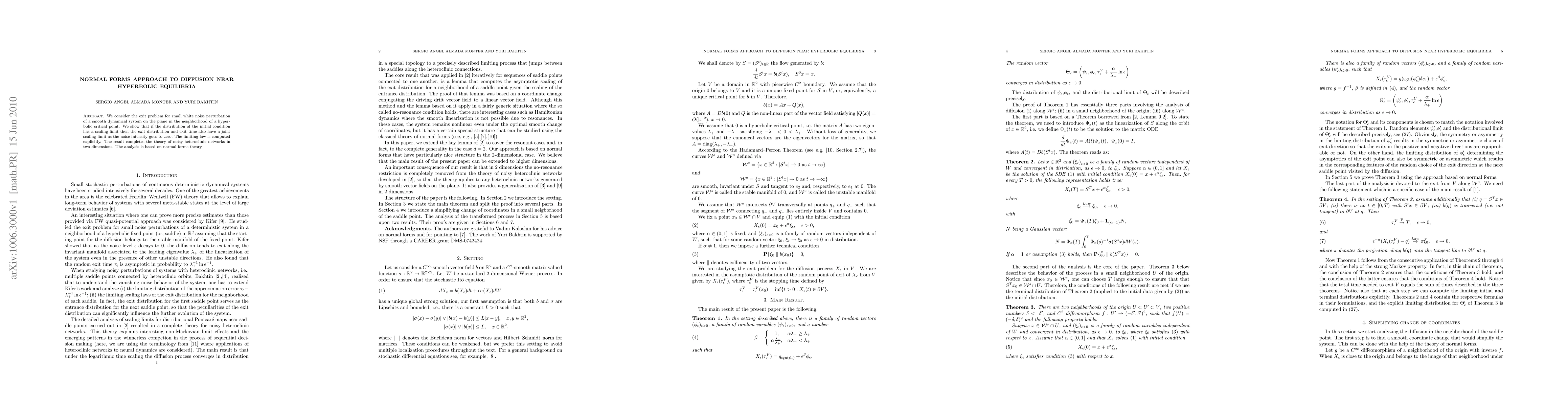 We consider the exit problem for small white noise perturbation of a smooth dynamical system on the plane in the neighborhood of a hyperbolic critical point. We show that if the distribution of the initial condition has a scaling limit then the exit distribution and exit time also have a joint scaling limit as the noise intensity goes to zero. The limiting law is computed explicitly. The result completes the theory of noisy heteroclinic networks in two dimensions. The analysis is based on normal forms theory.