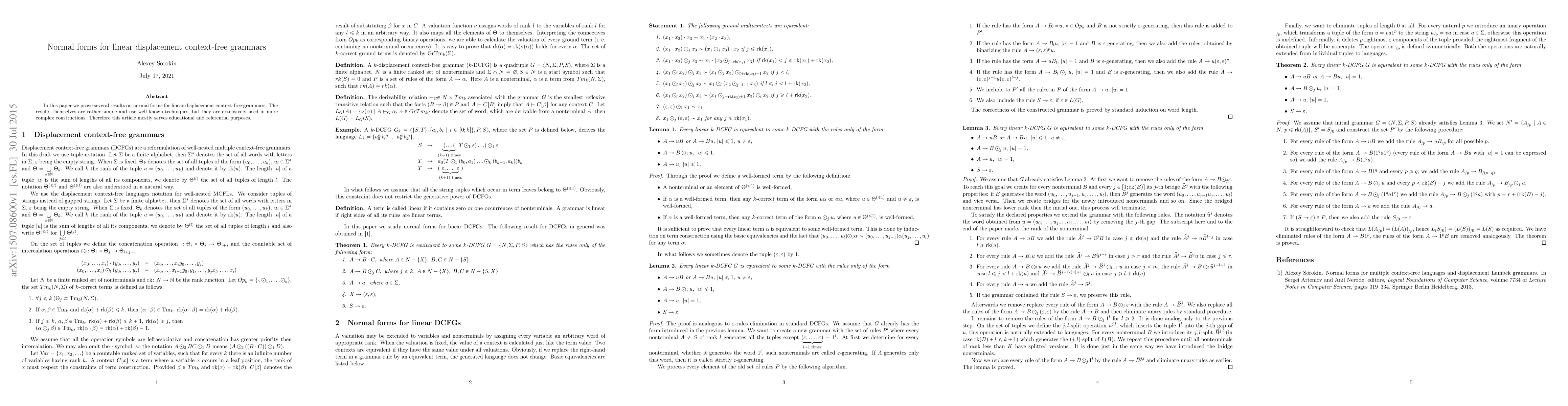 In this paper we prove several results on normal forms for linear displacement context-free grammars. The results themselves are rather simple and use well-known techniques, but they are extensively used in more complex constructions. Therefore this article mostly serves educational and referential purposes.