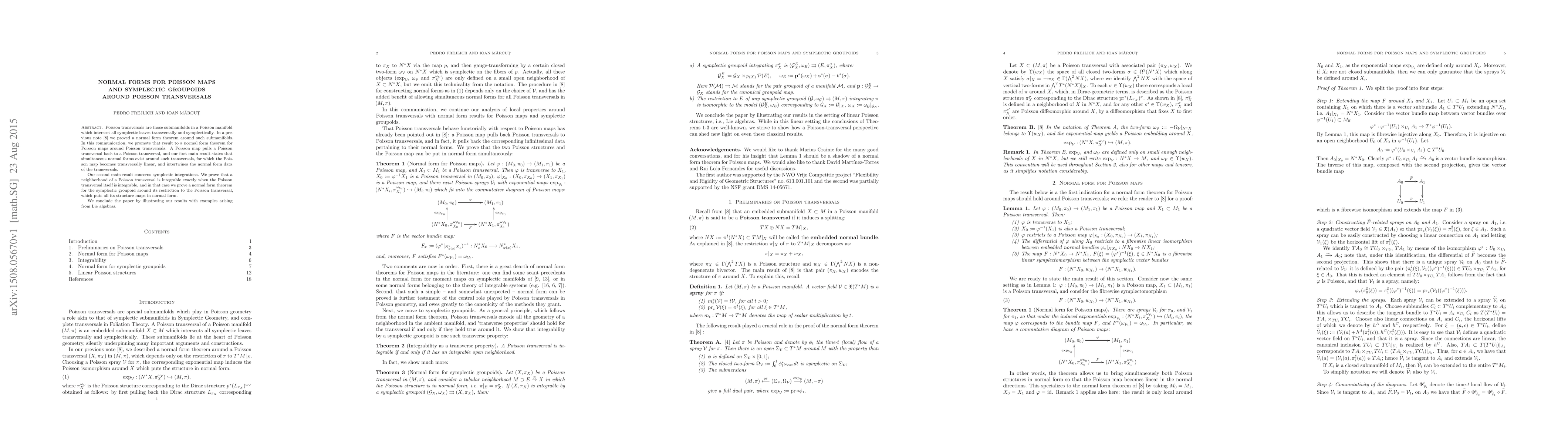 This paper establishes normal form theorems for Poisson maps around Poisson transversals, showing that such maps become transversally linear. It also proves that a neighborhood of a Poisson transversal is integrable if and only if the transversal itself is integrable, with a corresponding normal form for the symplectic groupoid. Examples from Lie algebras are provided to illustrate these results.