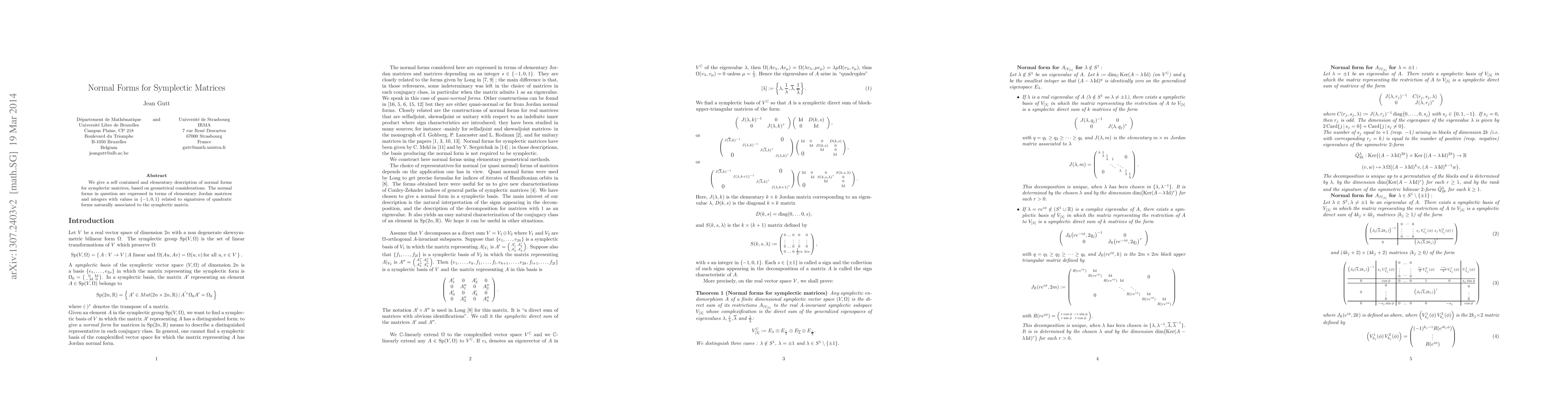 This paper presents an accessible explanation of normal forms for symplectic matrices, utilizing geometric insights to describe them through elementary Jordan matrices and integers corresponding to the signatures of associated quadratic forms.